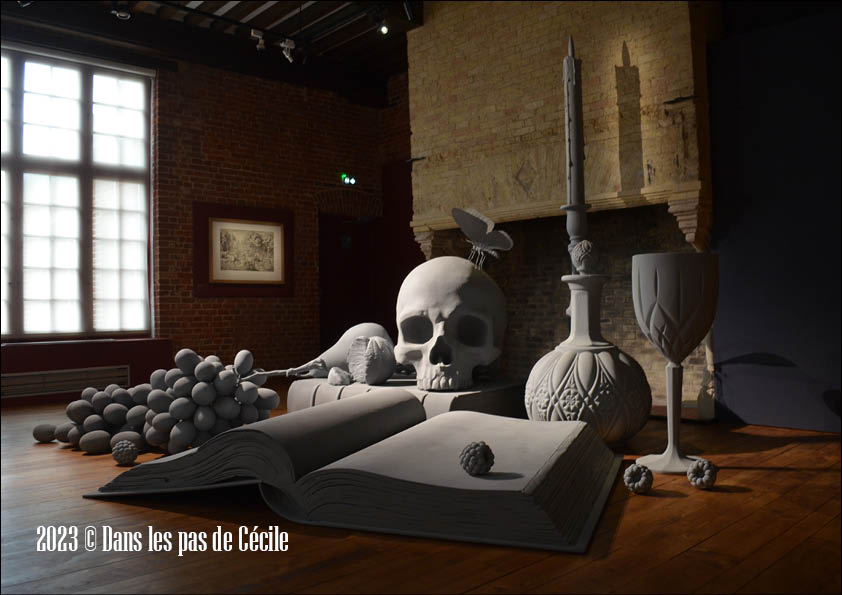 Vanitas XL est assez transparente au niveau de l’interprétation, surtout si vous regardez les tableaux accrochés autour de vous dans la salle. Elles sont quasiment toutes regroupées sous le thème de la vanité, ou nature morte. C’est-à-dire la représentation d’objets inanimés. C’est un genre apprécié des peintres flamands qui ont représentés les fleurs, les fruits et les légumes, les animaux dans des compositions plus ou moins sophistiquées, avec le thème de l’éphémère, le temps qui passe comme interprétation.