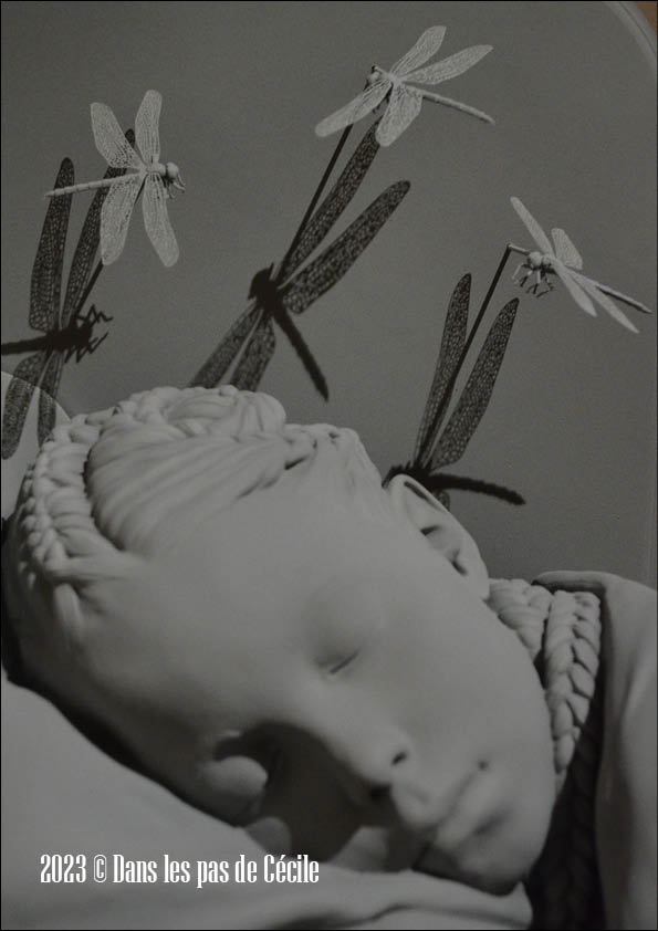 Girl asleep est un autre coup de cœur de l’exposition. Cette jeune fille ensommeillée avec au-dessus de sa tête plusieurs libellules qui symbolisent ici le sommeil. Une sérénité est ressentie devant l’œuvre qui évoque aussi la parentalité. Ce sentiment de plénitude que le parent a devant son enfant, paisible en train de dormir…