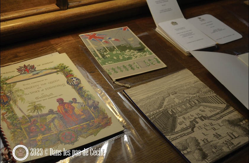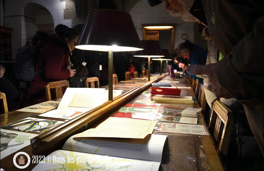 En passant le long des rayonnages, une question nous est venue à l’esprit. Comment sont classés les ouvrages ? Parce qu’ils ont toutes une couverture imprimée en cuir. La réponse est toute bête : par taille ! Les plus grands sont placés en bas des rayonnages et les plus petits en hauteur.