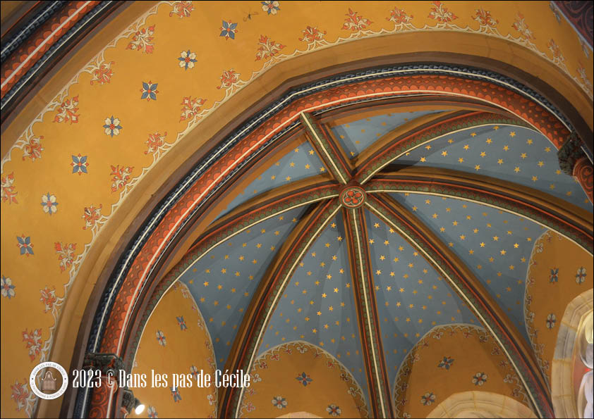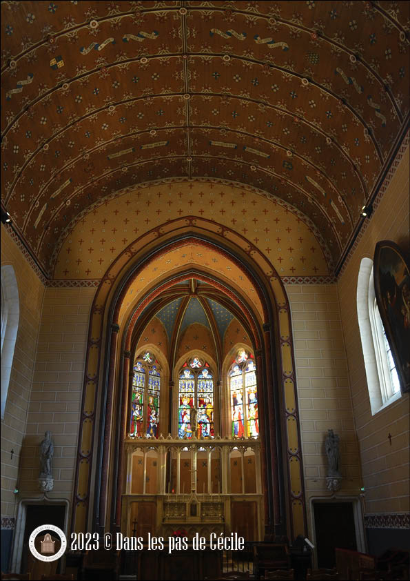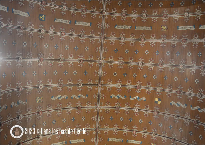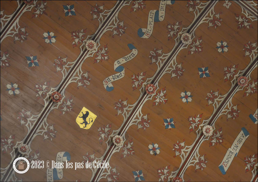 … chapelle qui a été restaurée au 19e siècle. Plusieurs éléments intéressants sont à notés. La tribune datant du 19e siècle reprend l’histoire des ducs, les vitraux sont également de la même époque. Mais surtout le plafond ! ll est entièrement peint et des blasons sont visibles.