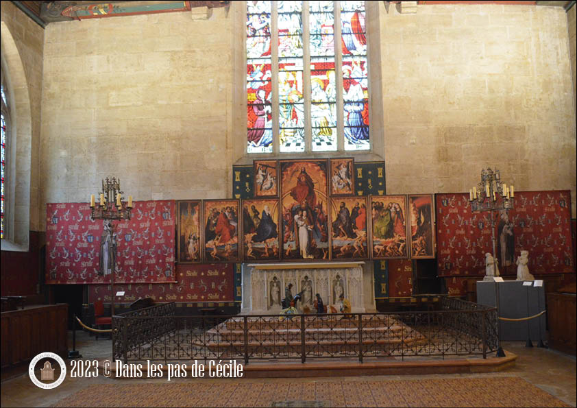 Pour accéder à la chapelle, il suffit de passer la clôture en bois qui avait comme fonction de séparer l’espace sacré de l’espace profane. Une reproduction du polyptyque de Van der Weyden est positionné au-dessus de l’autel, place d’origine de celui-ci. La chapelle sera restaurée au 19e siècle avec la volonté de revenir aux formes primitives. Parce qu’au moment de choix, c’est un décor-néo-classique qui était visible avec des murs peints en faux-marbre.