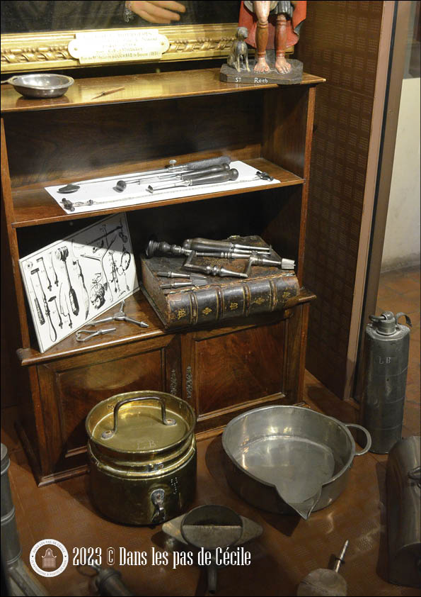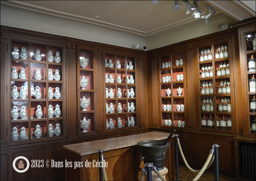 La dernière salle du parcours est l’apothicairerie, une salle qui m’impressionne toujours quelque soit le lieu (celle de l’Hospice Comtesse de Lille, celles du CIAP le 1204 à Dijon…). De voir ces dizaines de pots contenant les ingrédients ou les remèdes réalisés est toujours impressionnant, et cela permet aussi de voir l’évolution de la médecine, des soins apporter aux corps et à l’âme.