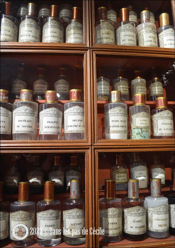 N’oublions pas non plus, qu’à l’époque tous les remèdes sont réalisés sur place. La forme des pots déterminent le contenu (sirops, eaux, pilules ou onguents) et les pots en verre (au nombre de 200(!) lors de l’inventaire révolutionnaire) conservaient les substances parfois surréalistes pour nous (poudre de guimauve, ambre gris, pierre divine, sel d’absinthe) mais dont les vertus thérapeutiques étaient tenues en haute estime à l’époque.