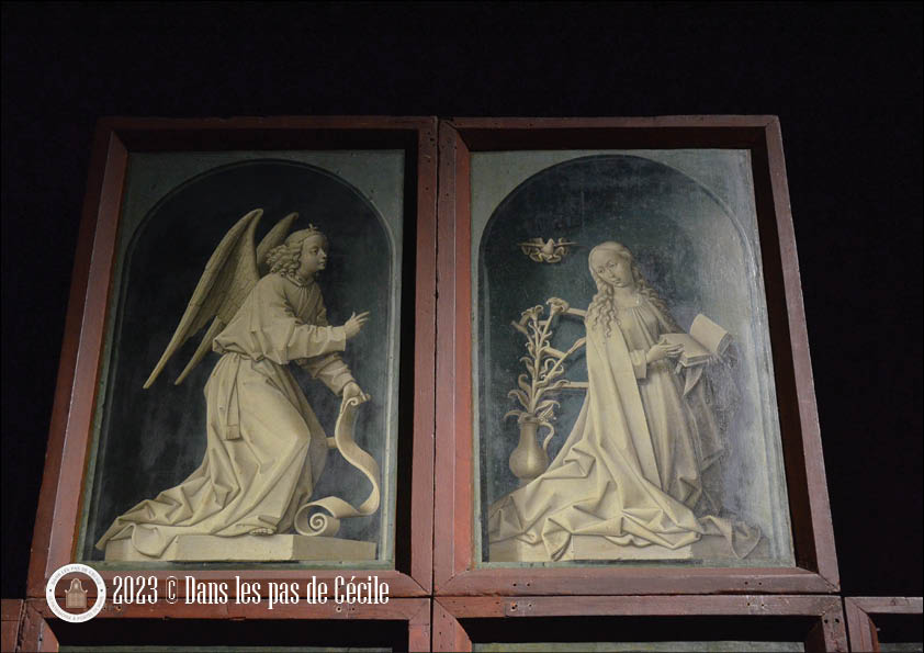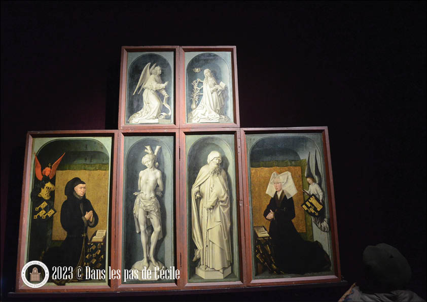 L’œuvre a été démonté afin de pouvoir montrer le revers et l’avers. N’oubliez pas qu’habituellement les triptyques et polyptiques sont fermés ou ouverts en fonction du calendrier liturgique.