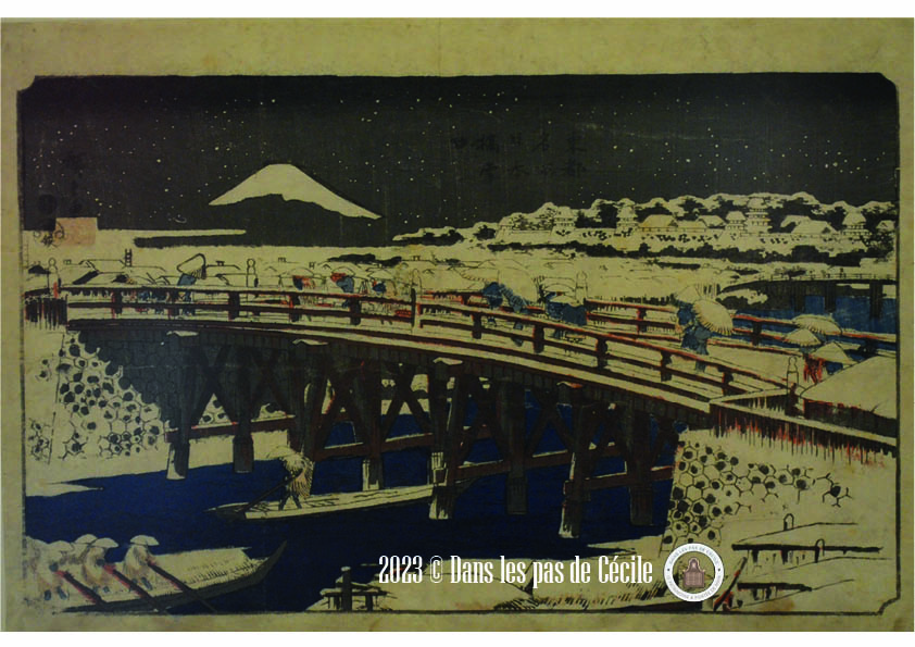 Le paysage enneigé d’Hiroshige fait partie de la série Célèbres vues de la capitale de l’est (Toto Meisho) et nous apercevons à nouveau le mont Fuji dans le lointain mais de nuit. La neige tombe de manière naturelle sur les chapeaux des personnages traversant le pont. La nature semble en suspension et très calme, sereine.