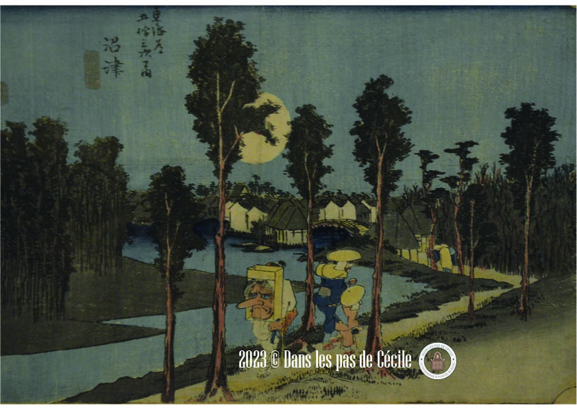La dernière estampe exposée est nommée Crépuscule à Numazu et elle a été réalisée par Hiroshige. Elle fait elle aussi partie d’une série : Cinquante-trois étapes de la route du Tōkaidō (qui relie Edo à Kyoto). Les deux personnages représentés sont en train de marcher et porte des éléments qui sont reconnaissables comme le masque de Tengu (créatures légendaires). C’est un démon qui a un long nez, et dans la religion shinto il s’agit d’une divinité en lien avec la protection des montagnes et de la forêt. Les personnages ont ainsi comme probable destination le sanctuaire de Konpira.
