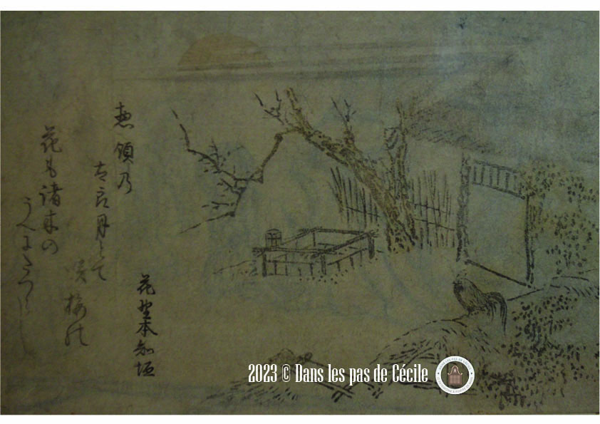 L’école Rinpa, connu pour son extrême épuration des sujets (parfois tendant jusqu’à l’abstraction) s’empare des sujets littéraires et ne conservant que les éléments paysagers qui y sont décrits. Une des œuvres exposés dans le focus est issu de cette école (issu de l’art d’Ogata Kōrin), il y a une très grande stylisation dans cette représentation qui tend vers l’abstraction.