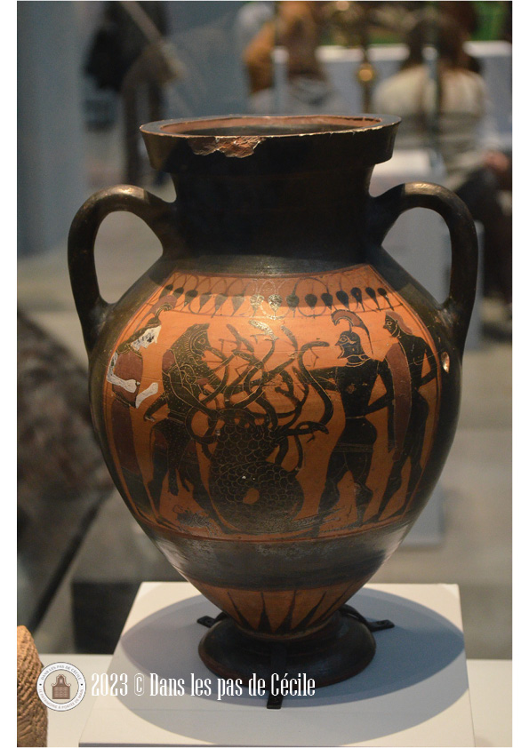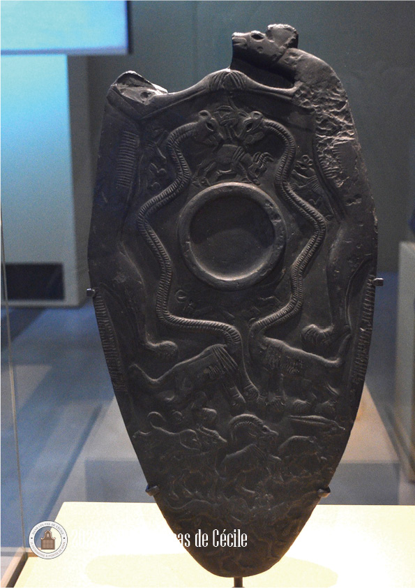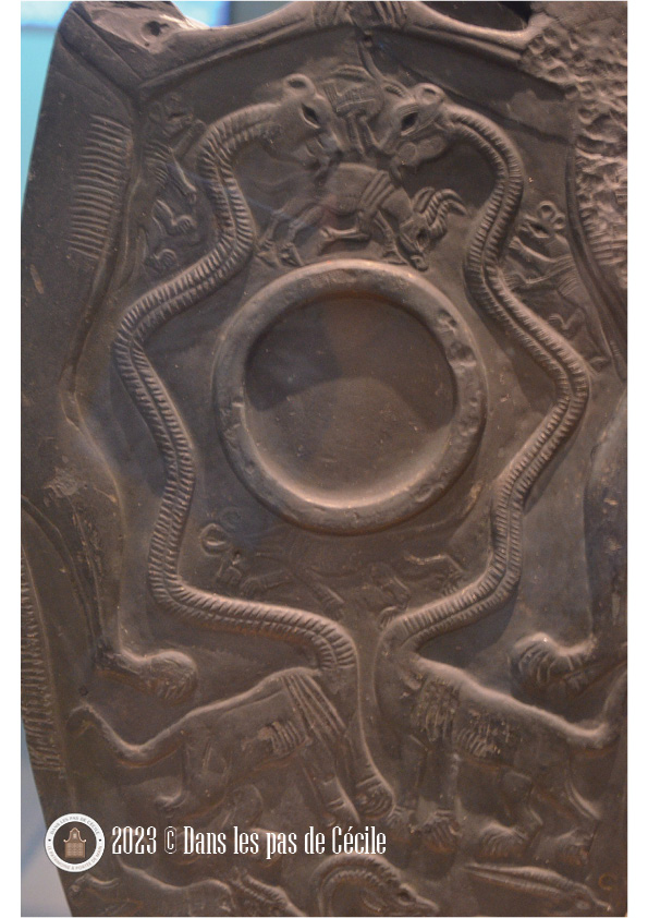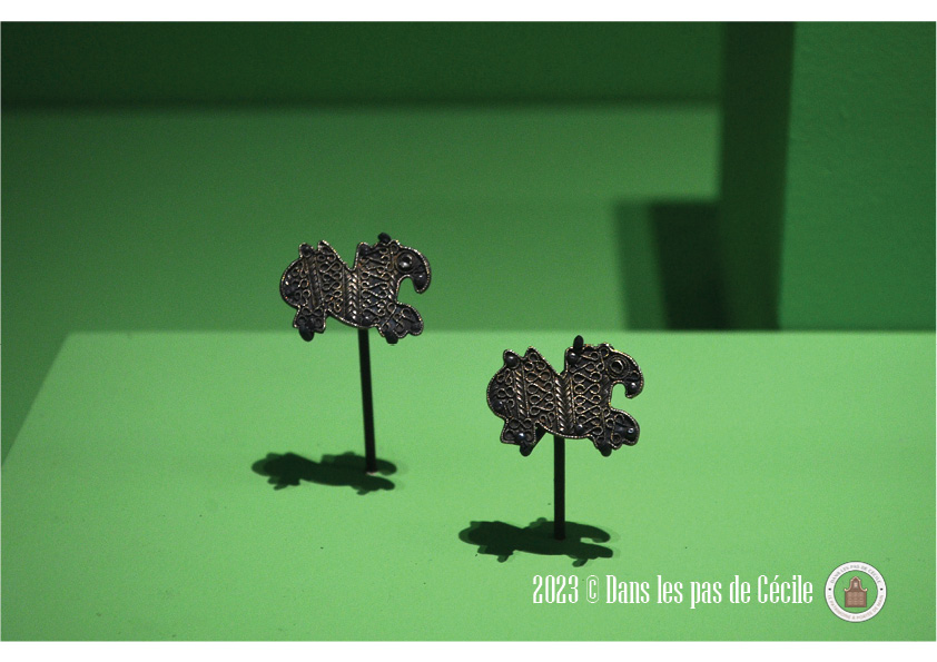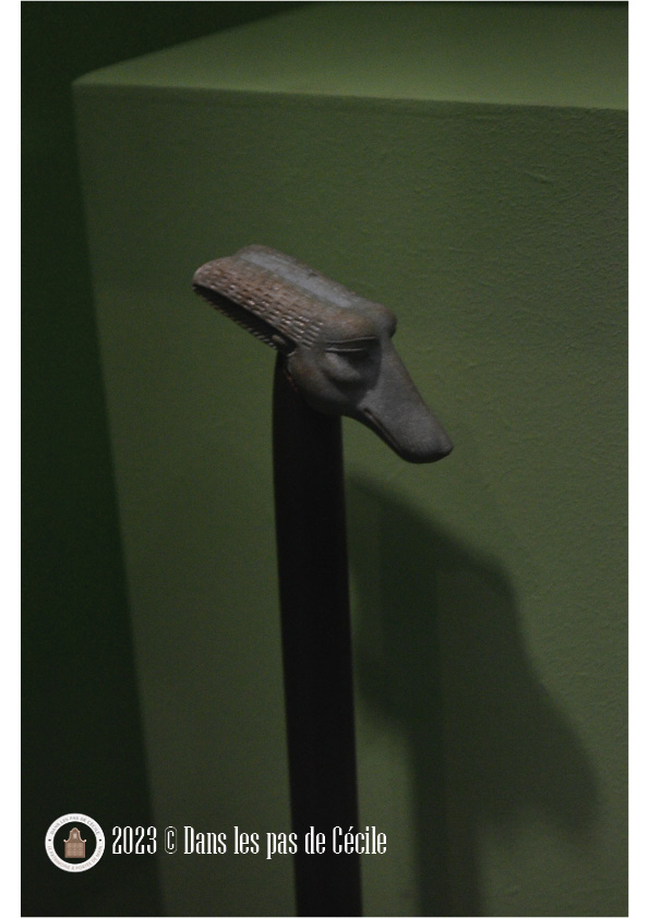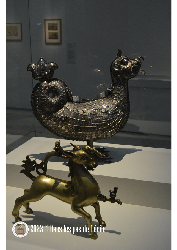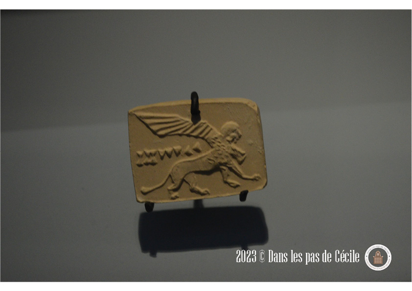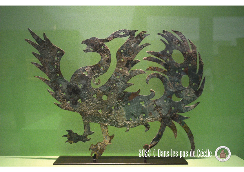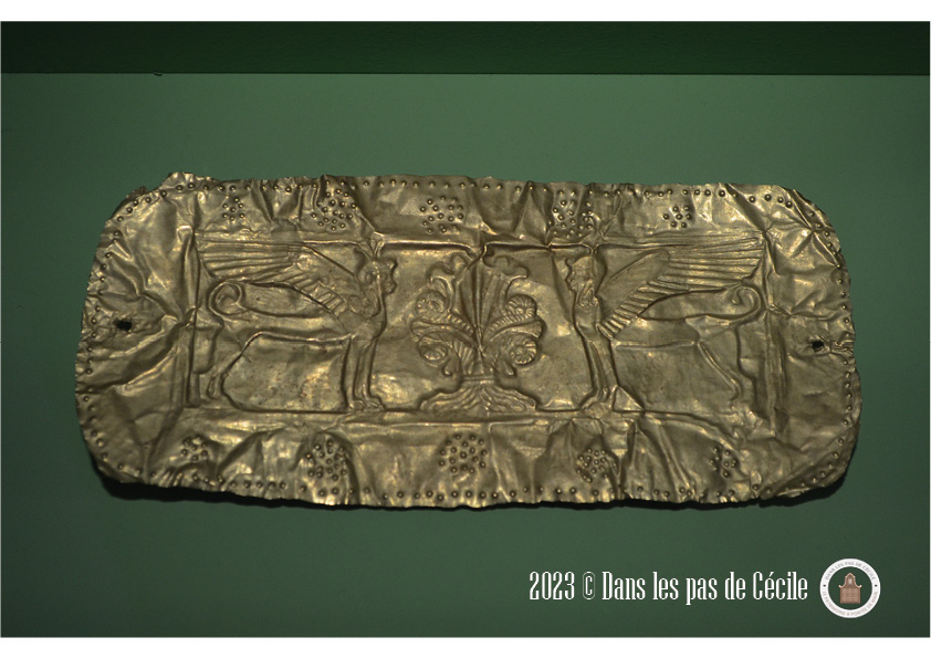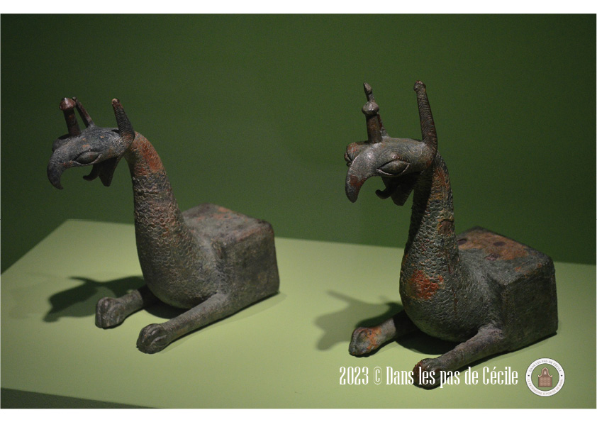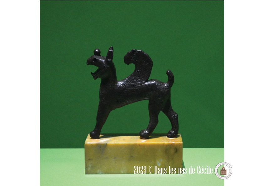 Une petite statuette de griffon est présentée et c’est l’occasion de se pencher sur cette animal fantastique. Plusieurs origines : l’Orient et certains éléments grecs sont visibles sur les productions de grands chaudrons votifs (le cou avec des écailles de serpent, le bouton sur la tête, le bec ouvert). Les griffons sont très souvent représenté sous forme de statuettes, de protomes (c’est un élément de décor en forme de buste d’homme ou d’animal), en fibules et en grand nombre atteste d’un caractère bénéfique et protecteur de la créature.