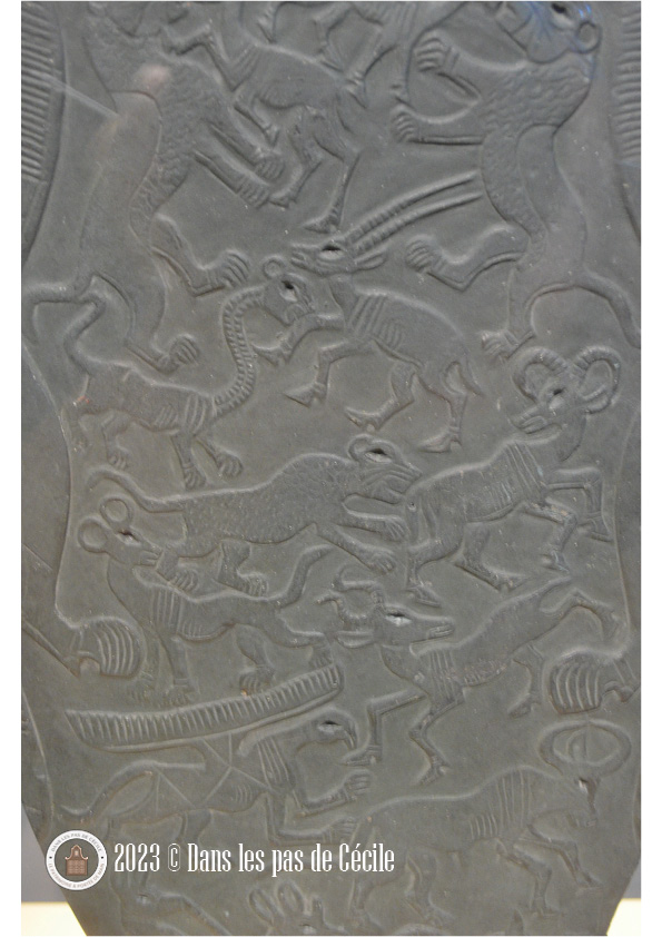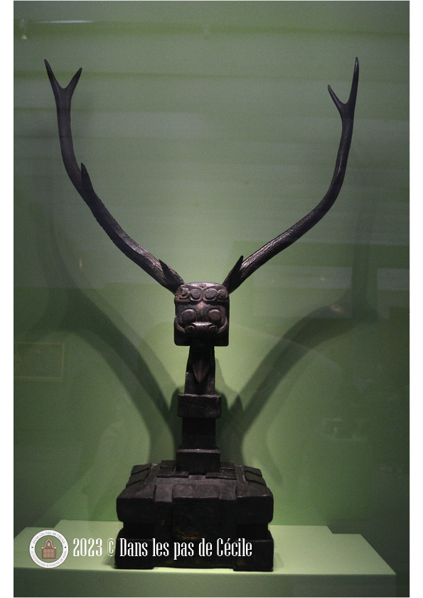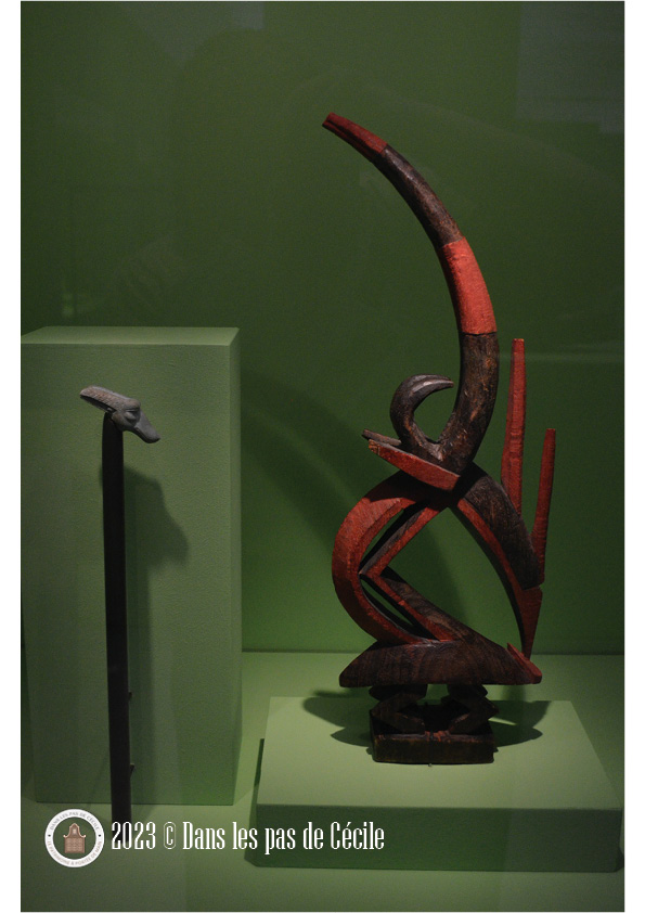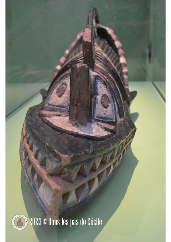 Une autre vitrine attire vite l’attention, c’est celle avec le masque provenant de Guinée, en Afrique. Il peut être regardé de deux manières différentes et notre perception change. En le regardant de face, c’est un visage plutôt humain qui nous fait face alors qu’en le regardant de côté, c’est un corps composé de multiples animaux connus : un peu de serpent, d’antilope, de caméléon et de crocodile. Ce casque était porté horizontalement sur la tête du danseur afin d’attirer la protection.