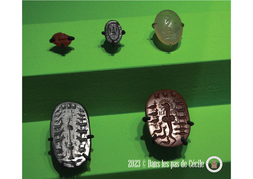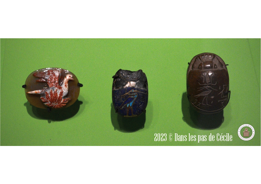 Sur le camée de gauche, vous pouvez apercevoir que l’animal représenté est un phénix. Son origine est probablement égyptienne, il serait fondé sur les représentations du bénou, qui est un oiseau divin représentant la faculté du soleil de renaître chaque matin. Au 5e siècle, l’auteur Hérodote décrit un oiseau rouge et or, qui sont les couleurs de l’aurore. Les auteurs Ovide et Pline l’Ancien réinterprètent la renaissance du phénix en le faisant s’immoler sur un nid d’encens.