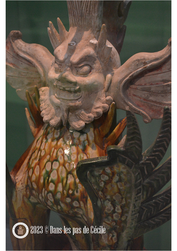 L’animal gardien de tombe est appelé le zhenmushou 鎮墓獸, et est typique de la période Chŭ (481-221 avt. J.C). Il a une tête coiffé de bois de cerfs, sa langue est tirée et cernée de crocs. Il était placé dans les nécropoles et était tourné vers le défunt, pour veiller sur lui ou l’empêcher de nuire aux vivants, qui sait ?