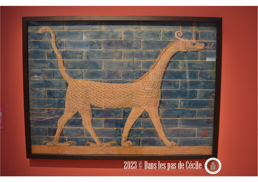 Le dragon-serpent représenté sur l’aquarelle figurait sur l’une des porte nord de la ville de Babylone, dite la « Porte d’Ishtar », qui est de nos jours reconstituée au Vorderasiatisches Museum de Berlin. Ce serpent furieux, « mushkhushshou », a un corps couvert d’écailles et une tête de serpent, des pattes de lion à l’avant et des serres d’aigles à l’arrière. Il est le compagnon du grand dieu de Babylone prénommé Marduk.