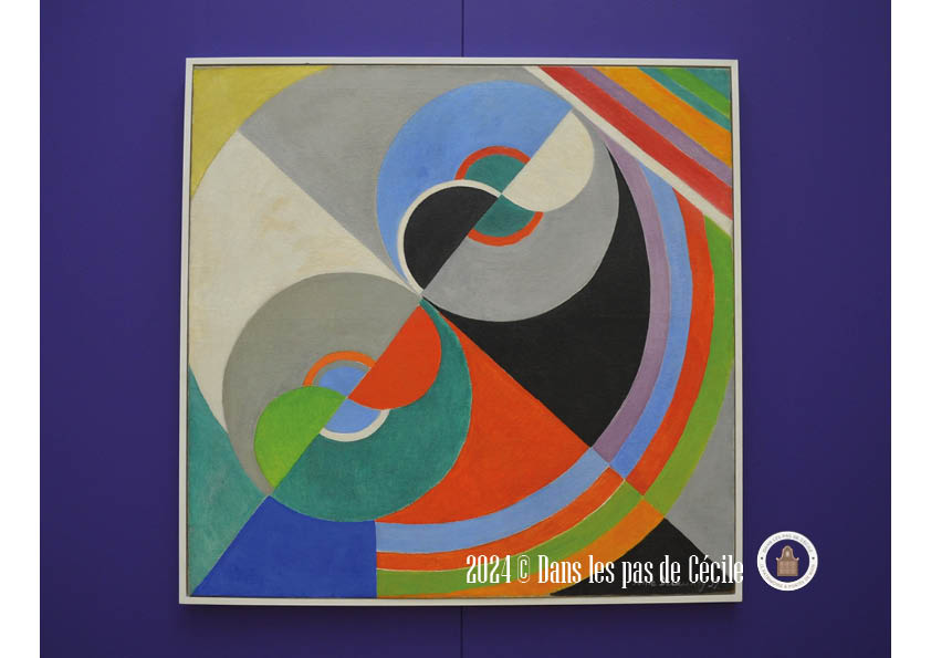 Sonia Delaunay, Rythme Couleurs 1076, 1939 : « Le nom de Sonia Delaunay est longtemps resté associé à celui de son compagnon, Robert Delaunay. Alors qu’elle est encore jeune, la question qui la tourmente est celle de sa vocation d’artiste en tant que juive mais surtout en tant que femme. Après son enfance à Saint-Pétersbourg, elle étudie la peinture à Karlsruhe avant de s’installer à Paris en 1906, où elle s’inscrit à l’académie de la Palette. Nourrissant une pratique novatrice dans le champ de l’abstraction et des arts appliqués, Sonia Delaunay défend une liberté totale des formes et des couleurs. Cette toile s’organise selon un rythme de cercles concentriques colorés dont résulte une composition joyeuse et modulable à l’infini. La couleur n’est plus seulement le moyen de peindre mais devient le sujet de la peinture. »