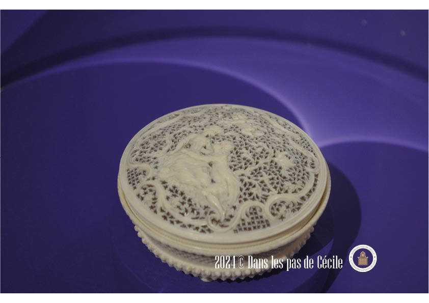 Anonyme, boite en ivoire mosaïqué, seconde moitié du 18e siècle : « Dieppe est reconnue au 18e siècle comme l’un des principaux centres d’importation et de transformation de l’ivoire en Europe. Les ivoiriers y produisent une grande variété de petits objets. Râpes à tabac, éventails et étuis font alors la réputation des ateliers de la ville. Ornant le couvercle de cette boite, d’élégantes volutes encadrent le badinage d’un jeune couple couronné par un petit amour. La scène se détache d’un fond ajouré, délicatement percé à la scie et rappelant la finesse de la dentelle. Cette technique de décor dit « mosaïqué » est caractéristique des productions dieppoises du 18e siècle. Fruits d’un travail long et virtuose, ces réalisations semblent avoir été souvent confiées aux femmes. Peut-être l’une de ces ivoirières est-elle la créatrice du couvercle de cette boite ? »