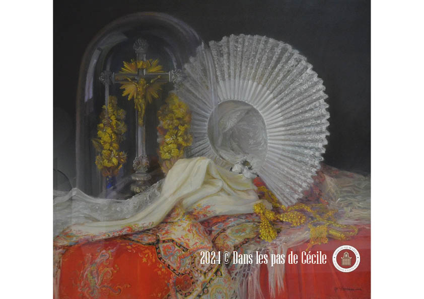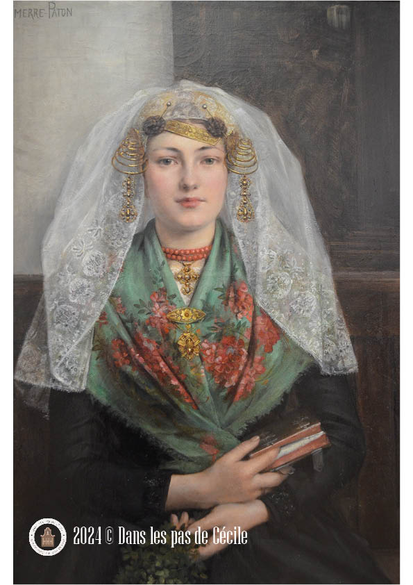« Fille de l’autrice Emilie Paton, dont elle garde le nom, Jacqueline Fleurichamp grandit dans un milieu artistique et apprend très tôt à dessiner et à peindre. Élève d’Alexandre Cabanel, elle épouse en 1881 le peintre lillois Léon Comerre, dont le musée conserve l’œuvre Samson et Dalila. Jacqueline Comerre-Paton obtient une mention honorable au Salon des artistes français en 1882. Accaparée par sa vie privée, elle cesse d’exposer au Salon en 1897 mais envoie chaque année un tableau à l’exposition de l’Union des femmes peintres et sculpteurs dont elle est membre du comité. Dans cette représentation de femme en costume traditionnel, restaurée pour l’exposition, la peintre met sa technicité au service des détails de la parure de bijoux qui magnifie la beauté du modèle, le rendant particulièrement vivant ».