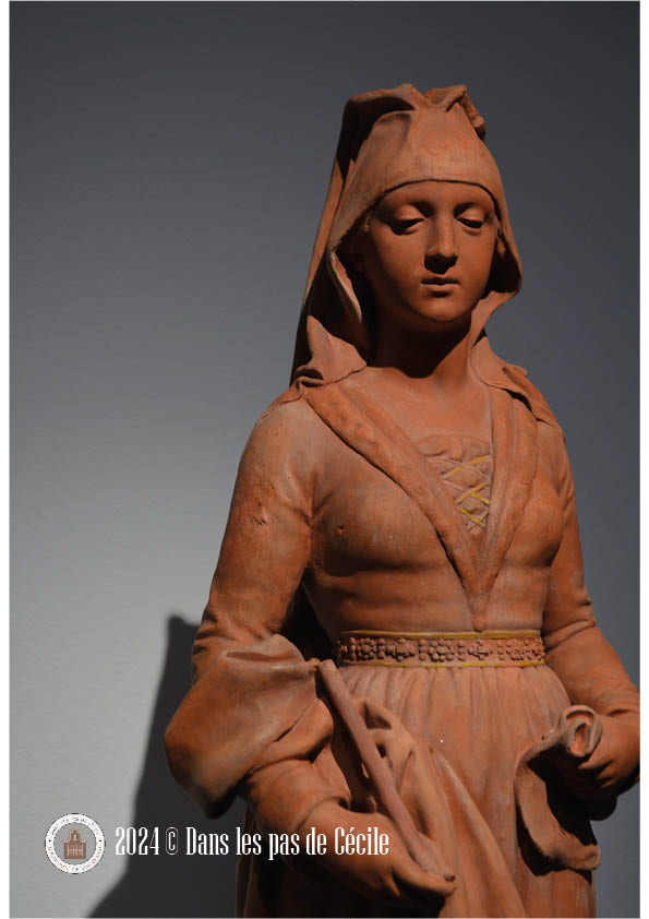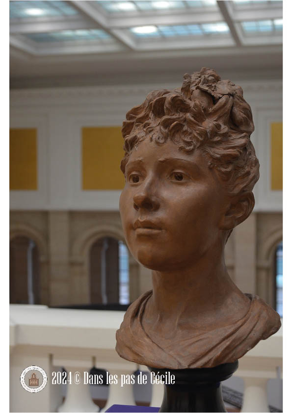 Camille Claudel, Louise Claudel (future Mme de Massary), 1885 : « Camille Claudel est une artiste précoce qui croque ses frère et sœur et impose à ses parents son choix de devenir sculptrice. A défaut de pouvoir suivre les cours de l’École des beaux-arts interdite aux femmes, elle s’inscrit à l’académie Colarossi. Installée rue Notre-Dame-des-Champs dans un atelier qu’elle partage avec d’autres sculptrices, dont Madeleine Jouvray, elle reçoit l’enseignement d’Alfred Boucher. En 1884, elle devient l’apprentie et l’amante d’Auguste Rodin. Ils s’influencent mutuellement au cours d’une relation tumultueuse et tragique qui mène à l’internement psychiatrique de Camille Claudel en 1913 et sonne le glas de sa carrière. Ici, la sculptrice prête au buste en terre cuite de sa sœur Louise son impétuosité qui tranche avec sa vie rangée d’épouse et de mère de famille ».