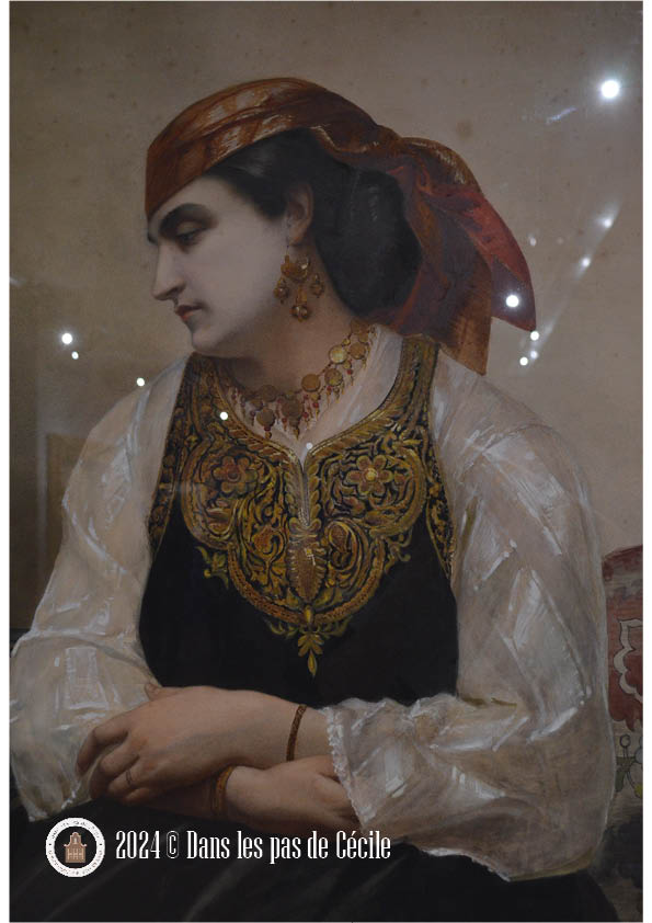 Mathilde Bonaparte, Une juive d’Alger, 1866 : « Nièce de napoléon, Mathilde Bonaparte est à la fois artiste, mécène et collectionneuse. Exilée en Italie, elle développe un goût pour les arts dès l’enfance. Elle se forme auprès du peintre Michel Ghislain Stapleaux, élève de jacques-Louis David, et d’Ida Botti Scifoni. Installe à Paris en 1846, elle tient avec le soutien de son cousin Napoléon III un Salon littéraire et artistique et devient une des personnalités incontournables de la capitale. Parallèlement, elle expose au Salon officiel entre 1850 et 1870. La Juive d’Alger y est présentée en 1866. Ce portrait reflète le style orientaliste et historiciste en vogue à l’époque. Mathilde Bonaparte œuvre toute sa vie en faveur des artistes, si bien que le critique littéraire Charles-Augustin de Sainte-Beuve la surnomme « Notre-Dame des arts » ».