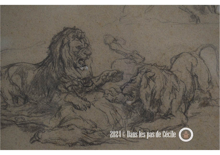 Rosa Bonheur, Étude de lions, troisième quart du 19e siècle : « Très tôt, Rosa Bonheur se spécialise dans la peinture animalière. Observation artistique et étude scientifique se combinent lorsque, habillée en homme, elle fréquente les abattoirs et pratique la dissection. Dans sa ménagerie à By-Thomery, l’artiste élève et dessine de nombreux animaux, dont un lion arrivé en 1880. Son immense succès et son aisance financière lui permettent de renoncer à participer au système des Salons, où elle expose depuis l’âge de 19 ans. Émancipée et non-conformiste, Rosa Bonheur fascine les mouvements féministes américains. Comme Charlotte de Rothschild, sœur du donateur de cette étude de lion, elle est membre d’honneur de l’Union des femmes peintres et sculpteurs. Chevalier de la Légion d’honneur en 1865, elle devient en 1894 la première femme officier de la Légion d’honneur. »