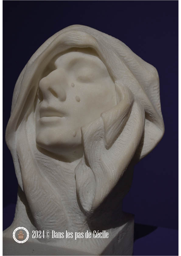 Madeleine Jouvray, Tête, La Douleur, 1886 : « Madeleine Jouvray fait partie des artistes longtemps restées méconnues et auxquelles aucune exposition n’a encore été consacrée. Sculptrice, elle se forme à l’académie Colarossi et dans différents ateliers privés, auprès des sculpteurs Auguste Rodin, Alfred Boucher et Honoré Icard. Elle participe au Salon des artistes français à plusieurs reprises entre 1889 et 1901, puis rejoint en 1904 le Salon de la Société nationale des beaux-arts, où elle expose de nombreuses fois jusqu’en 1914. Comme Camille Claudel, rencontrée lorsqu’elle était élève d’Auguste Rodin et avec qui elle aurait partagé un atelier rue Notre-Dame-des-Champs à Paris, nombre de ses sculptures sont entrées dans des collections publiques grâce à la générosité d’Alphonse et Charlotte de Rothschild. Alphonse a acquis ce marbre sur les recommandations d’Auguste Rodin et du critique Léon Gauchez. S la proximité esthétique avec les réalisations de Camille Claudel et d’Auguste Rodin a été mise en évidence, l’œuvre de Madeleine Jouvray conserve toute sa singularité dans le contexte du symbolisme, comme en atteste ici le sujet peu répandu d’un visage masculin voilé, iconographie généralement attribuée à un modèle féminin, qui, par ses yeux clos et sa bouche entrouverte, exprime une certaine sensualité. »