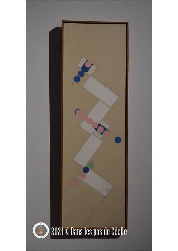 Marcelle Cahn, Allegretto II, 1966 : « Marcelle Cahn fait partie des artistes femmes du 20e siècle ayant récemment bénéficié d’une nécessaire redécouverte. Née à Strasbourg, elle part en 1915 à Berlin où elle étudie dans l’atelier de Lovis Corinth. Elle s’installe à Paris en 1920 et suit les cours de dessin de la Grande Chaumière. A la galerie l’Effort moderne, elle rencontre Fernand Léger dont elle devient l’élève. En 1930, elle participe à l’exposition « Cercle et Carré » réunissant les courants d’avant-garde au sein de l’abstraction puis expose, après la guerre, au Salon des réalités nouvelles. Soutenue par la galerie Denis René, l’artiste oriente définitivement son œuvre vers l’abstraction à partir de 1952. Sur des fonds blancs, elle trace des formes géométriques, évoquant ici des portées musicales, dans une constante recherche d’équilibre conjuguant rigueur et poésie. »