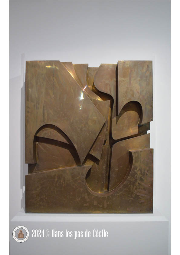 Lyse Oudoire, Relief, 1974 : « Lyse Oudoire se destine d’abord à la peinture. Elle suit la formation de l’école des beaux-arts de Lille de 1955 à 1957. A la fin des années 1950, elle participe activement à la création de l’Atelier des Monnaies, seule femme parmi les sept membres fondateurs de ce groupe de jeunes artistes qui entendent se libérer des contraintes de l’enseignement académique. Cette association lilloise organise annuellement une exposition destinée à présenter au public la création contemporaines artistique parisienne et internationale. Lyse Oudoire y expose chaque année jusqu’en 1964. Elle se tourne définitivement vers la sculpture après sa rencontre avec Henry Moore en 1968. Découpée dans le cuivre ou le laiton, ses œuvres aux formes lisses et incisives jouent sur les modulations de l’ombre et de la lumière. »