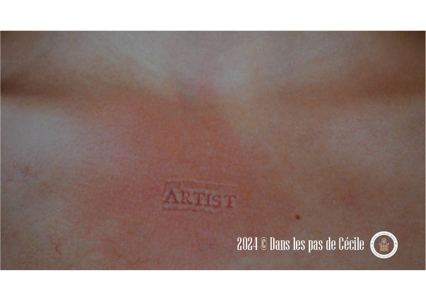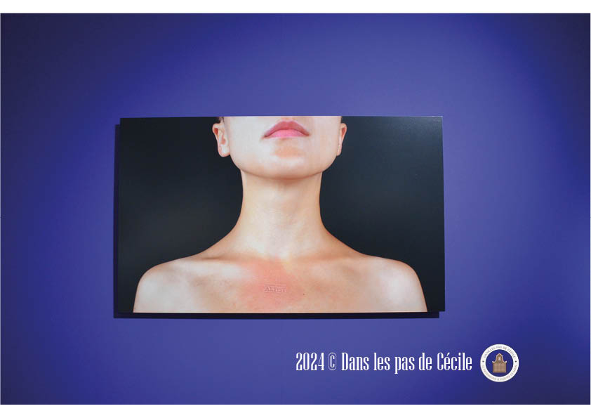 « Les œuvres de Roma Auskalnyte s’inscrivent dans le courant de l’art corporel, l’artiste usant de son corps à la fois comme matériau et comme support. Cette photographie appartient à un ensemble d’œuvres dans lesquelles elle se photographie ou se filme avec un mot imprimé à même la peau, ici « artiste ». L’esthétique stéréotypée de cette photographie évoque les images publicitaires tandis que la marque rouge laissée sur la zone d’impression témoigne de la violence du geste. Comme marquée au fer rouge, Roma Auskalnyte revendique son statut et même son « titre » d’artiste. Mais cet autoportrait anonymisé et nu peut aussi être interprété comme une critique de l’instrumentalisation des artistes femmes, considérées comme interchangeables et réduites à leur sexe par les institutions. »