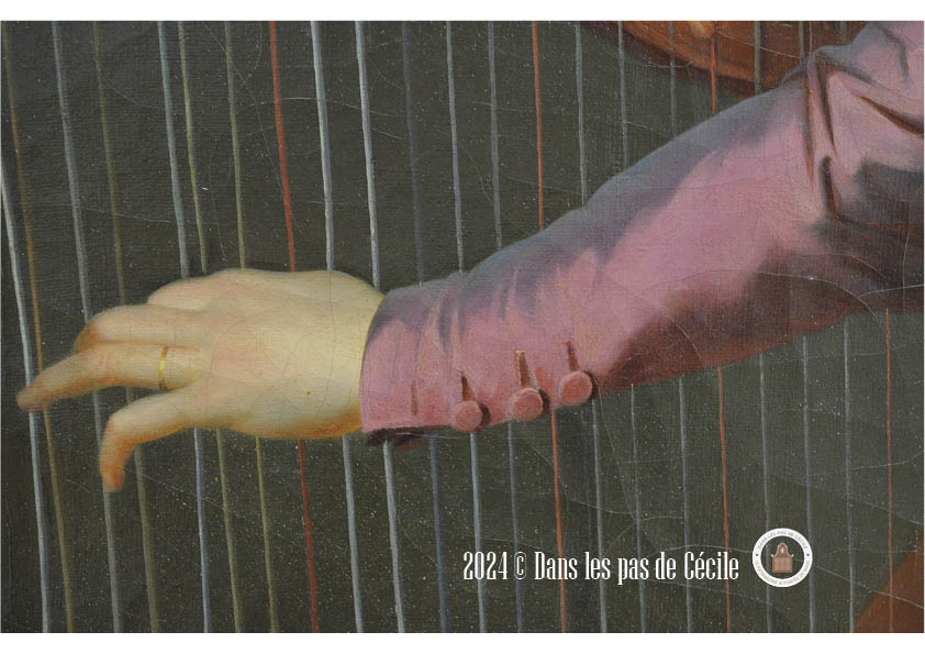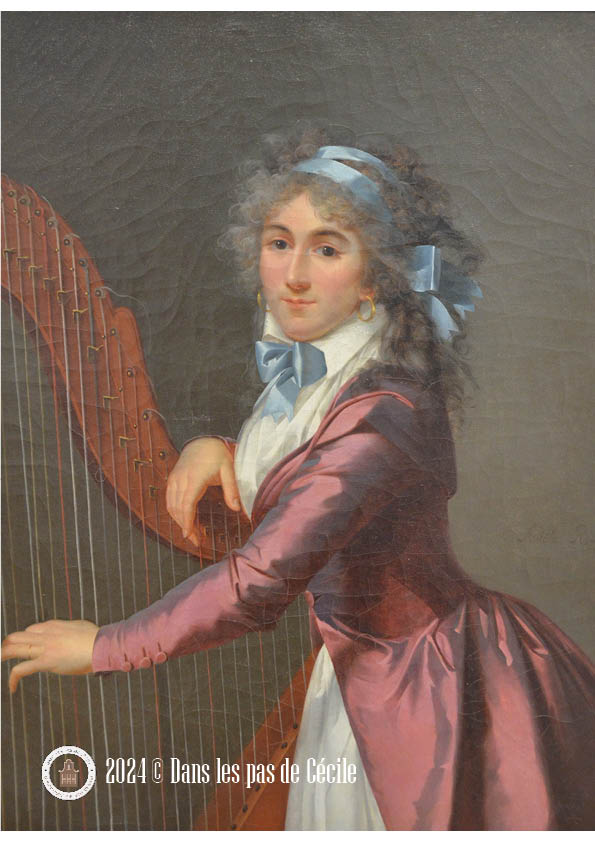 Portrait d’une jeune harpiste, Adèle Romany, vers 1795 : « Adèle Romany reçoit une formation dans l’atelier de Jean-Baptiste Regnault dont la section féminine est dirigée par son épouse Sophie Regnault. Reprenant la facture de son maître, sa peinture évolue vers une sensibilité romantique. Malgré son divorce en 1793, elle effectue sa carrière sous le nom de son mari, le miniaturiste François-Antoine Romany. Cette contemporaine d’Élisabeth Vigée-Lebrun est surtout connue pour ses portraits, d’artistes en particulier, dont elle fait sa spécialité. Son talent dans le rendu des matières et les détails des costumes s’y exprime à merveille. Cette jeune harpiste en est une parfaire illustration. Entré dans les collections lilloises comme « école française du 18e siècle », ce n’est qu’en 1966 que le tableau est attribué à Adèle Romany, progressivement redécouverte. »