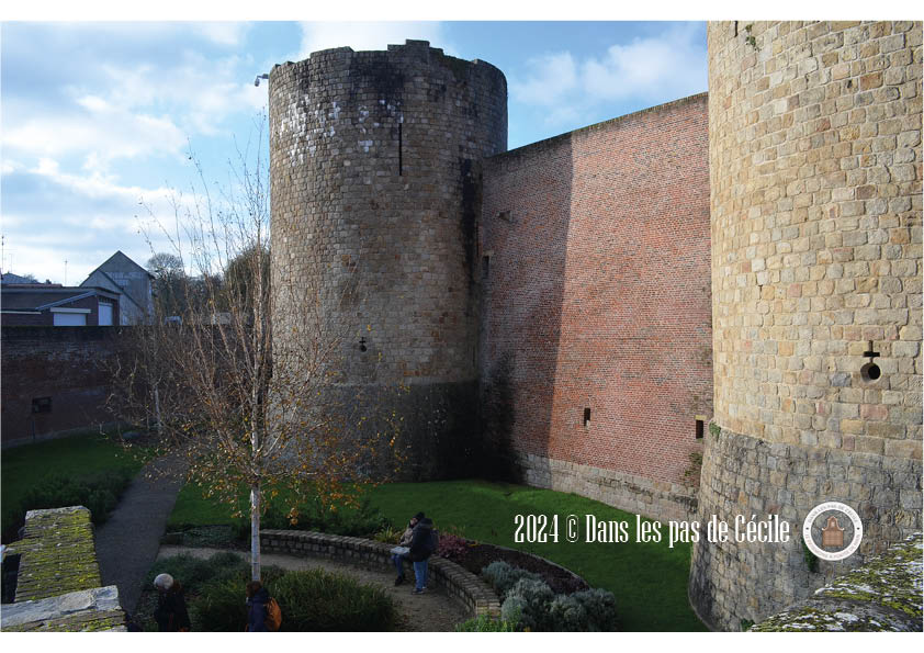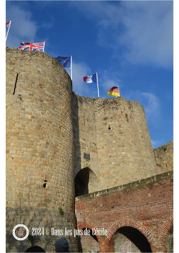 Concernant le château lui-même (au niveau de l’entrée de l’historial, que nous avons admiré sous un beau ciel bleu) : le duc de Dammartin avait en charge la défense de cette partie de la ville, le donjon va être détruit et reconstruit avec un format carré. Pendant la Seconde Guerre mondiale, beaucoup d’éléments seront perdus sur la tour de droite au niveau de l’entrée. On peut le voir visuellement avec les joints qui ne sont pas de la même couleur que le reste. C’est aussi cela le patrimoine ! Des détails que les matériaux nous donnent et qui traverse les siècles 😉