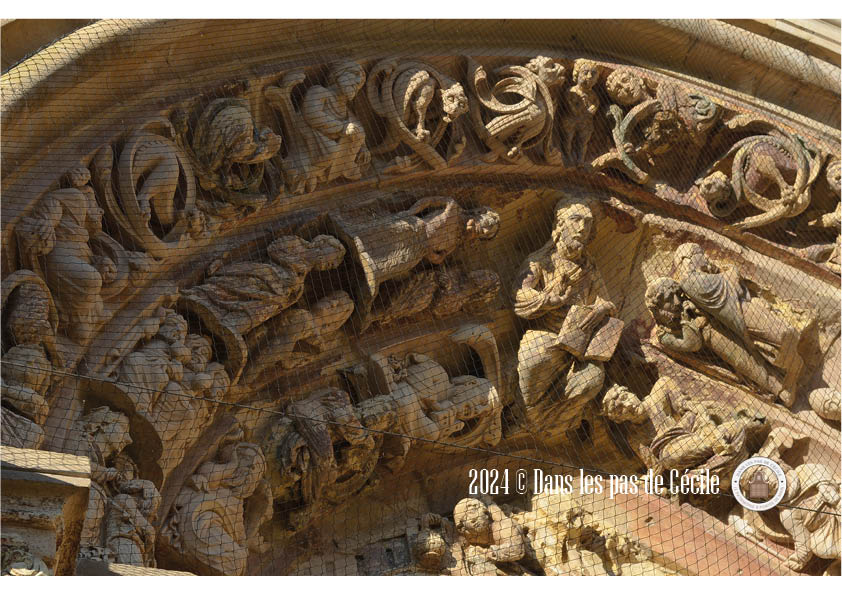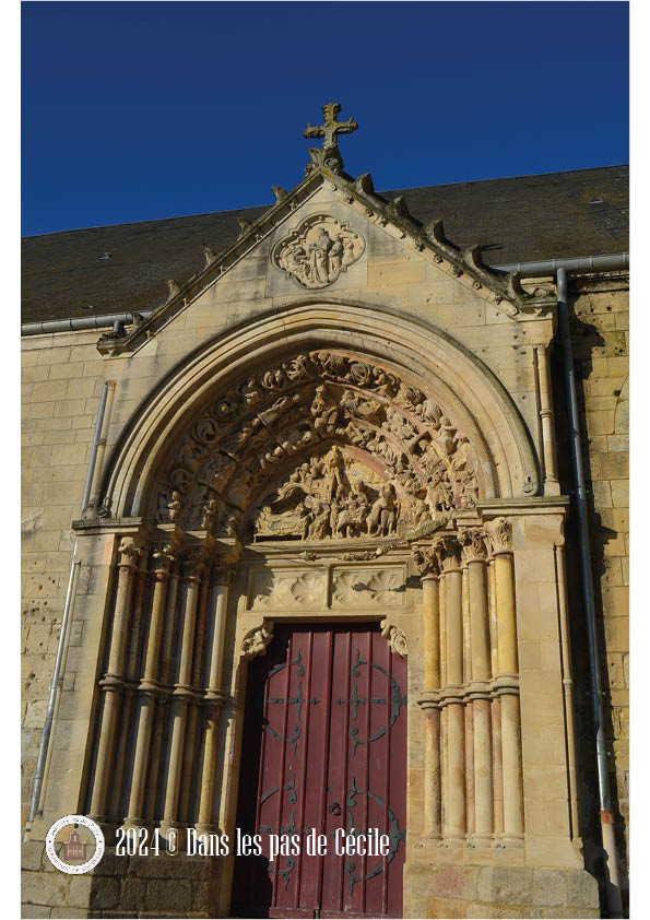 Le portail sculpté roman est classé aux Monuments historiques depuis 1862. Celui-ci sera restauré au 19e siècle. L’iconographie représente la Nativité, la Fuite en Égypte. Aux pieds de Marie, une colombe est visible (mais attention, il faut trouver le bon angle pour la repérer 😉). Dans la première voussure, on reconnaît Davis, alors que les étapes de la vie du Christ dans la deuxième voussure, avec le massacre des Innocents. Et la troisième voussure abrite des animaux fantastiques !