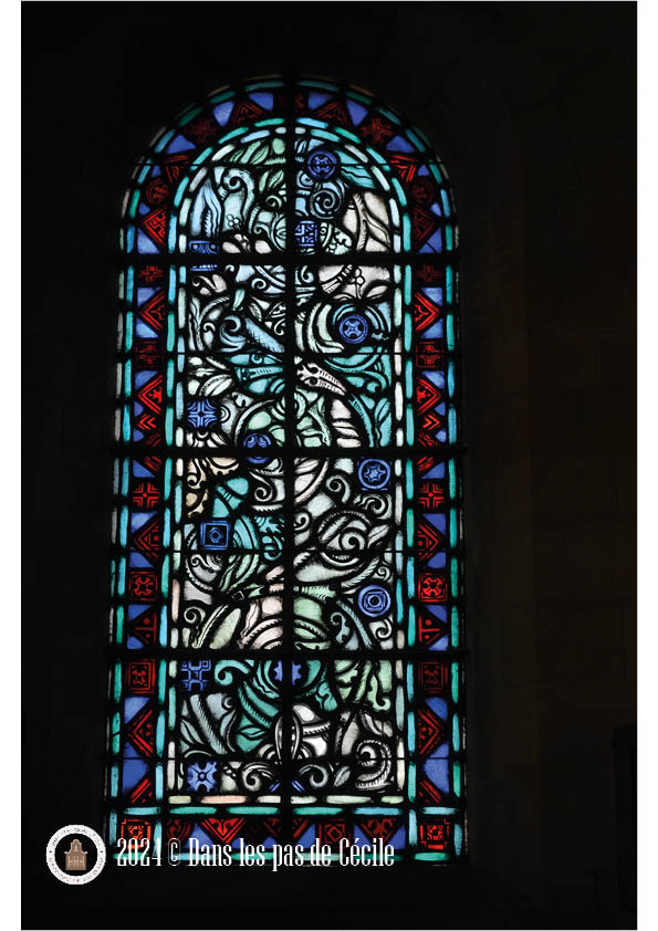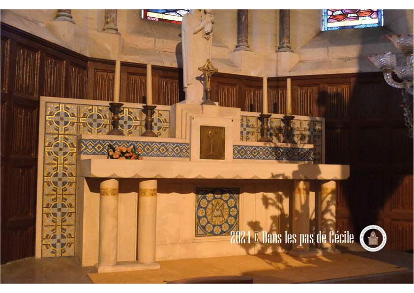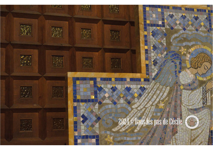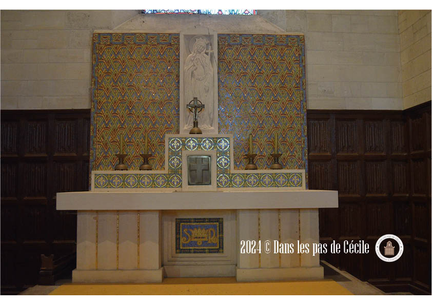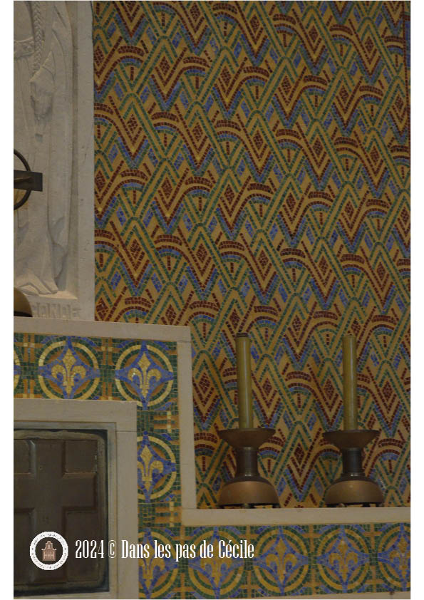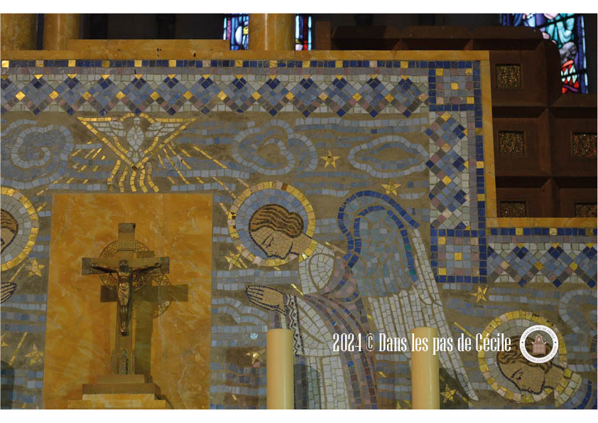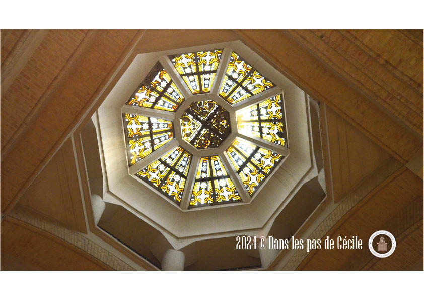 L’architecte se prénomme Chaigne et les dessins du mobilier sont signés Marcel Poutaraud. La coupole en béton et verre est réalisée par l’atelier Godin. Une des caractéristique de l’Art Déco, c’est que tout est pris en charge jusqu’au mobilier, donnant ainsi une homogénéité au lieu (autre exemple que j’ai déjà pu mettre en avant sur le blog : la villa Cavrois à Croix, dans la métropole lilloise : https://danslespasdececile.blog/2019/03/13/une-famille-industrielle-du-nord/ ) pour les panneaux en bois, les blocs de verre, les mosaïques sur l’autel principal en béton armé, ainsi que les autels secondaires ou encore les éléments de vitrage.