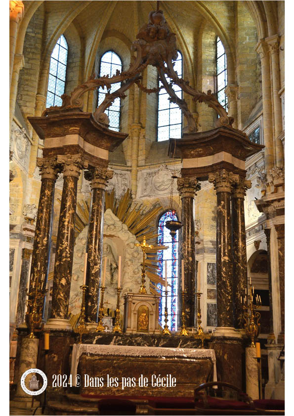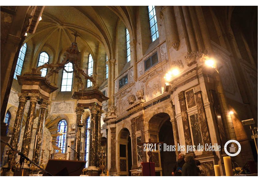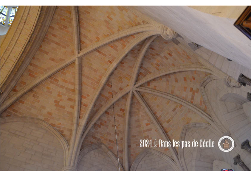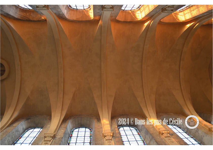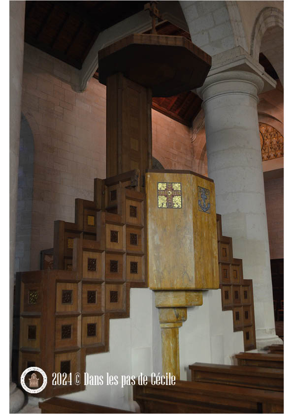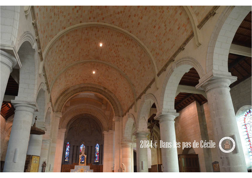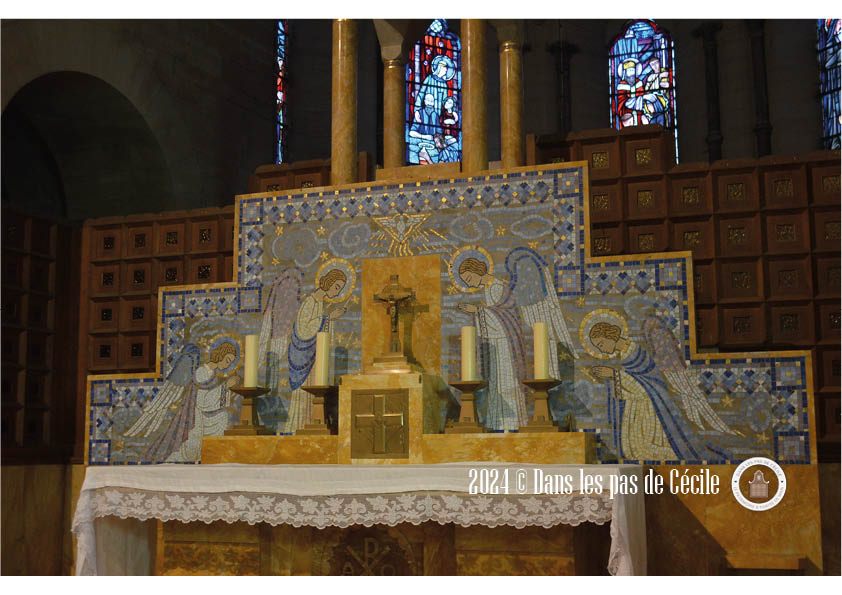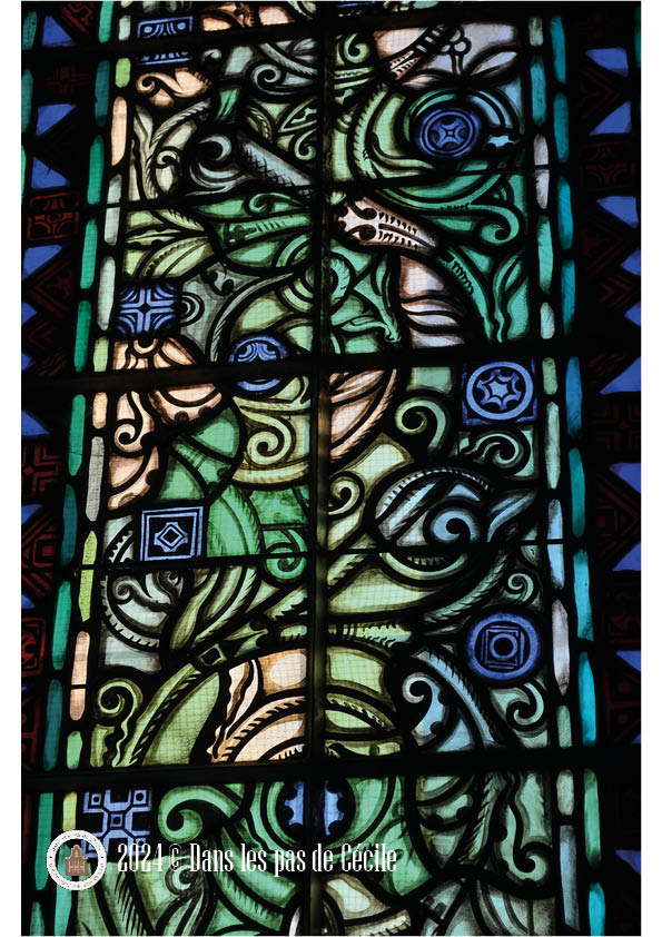 L’architecte se prénomme Chaigne et les dessins du mobilier sont signés Marcel Poutaraud. La coupole en béton et verre est réalisée par l’atelier Godin. Une des caractéristique de l’Art Déco, c’est que tout est pris en charge jusqu’au mobilier, donnant ainsi une homogénéité au lieu (autre exemple que j’ai déjà pu mettre en avant sur le blog : la villa Cavrois à Croix, dans la métropole lilloise : https://danslespasdececile.blog/2019/03/13/une-famille-industrielle-du-nord/ ) pour les panneaux en bois, les blocs de verre, les mosaïques sur l’autel principal en béton armé, ainsi que les autels secondaires ou encore les éléments de vitrage.