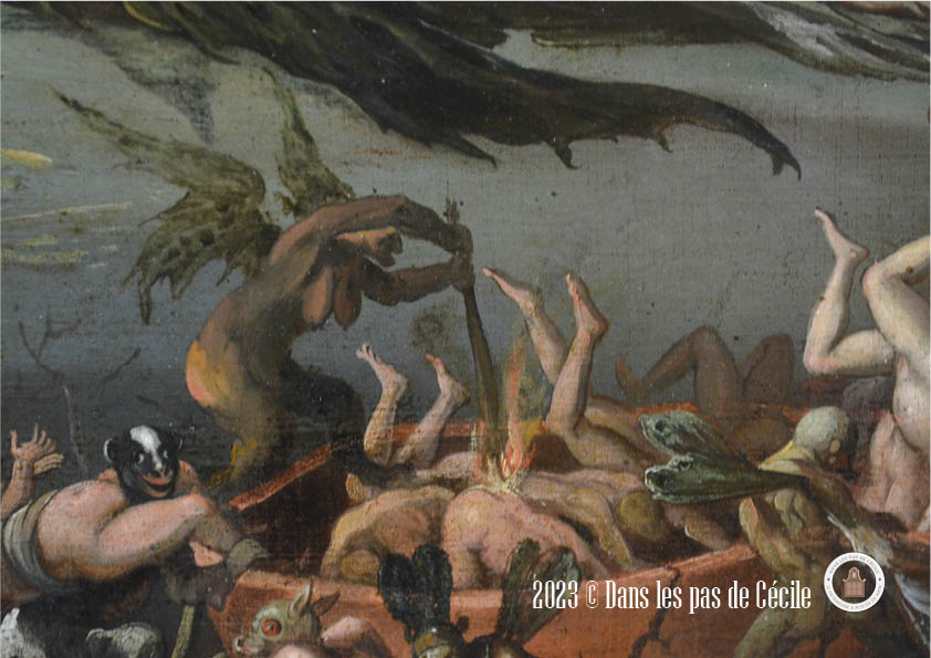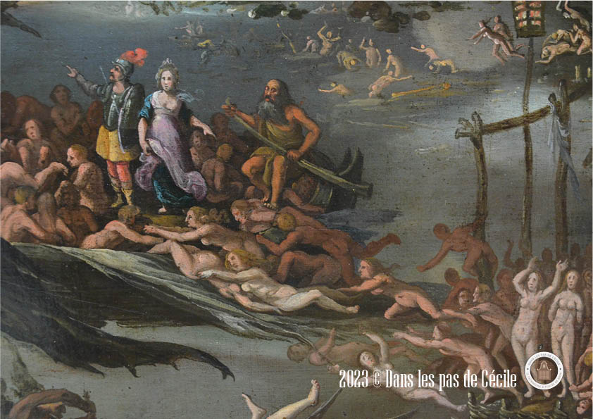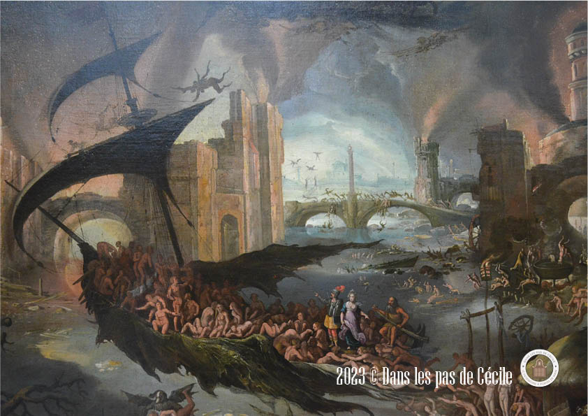 Le sujet du tableau est issu de l’Enéide. Il représente le moment où le héros, Enée, descend aux Enfers avec la sibylle Anchise. Le tableau est découpé en deux. On commence en bas à droite, lorsqu’ils entrent dans le royaume infernal, par le biais de l’énorme bouche du dieu Orcus, qui évoque de loin une grotte. Ensuite, il embarque à gauche avec Charon pour traverser le fleuve Styx. Tout autour d’eux, nous pouvons apercevoir les âmes damnées qui sont pourchassées et torturées par les démons qui ont des allures monstrueuses, dans la digne lignée de ceux représentées par les peintres flamands Bosch et Bruegel.