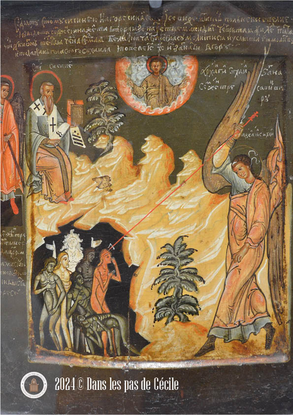 Le sujet représenté sur l’icône russe est rare. Il s’agit du saint Sisinios, qui a été martyrisé par l’empereur Dioclétien, invoqué en Orient pour chasser le diable. On peut repérer le saint, parce qu’il est assis sur le mont Sinaï, il tient les Evangiles et effectue le signe de bénédiction. Grâce à la prière, il aide l’archange Sihaïl à repousser les femmes nues de la grotte. Ces femmes ont été envoyé par le diable pour apporter sur Terre les sept types de fièvres malignes. Dans cette représentation, il y a la volonté de retenir captives ces femmes dans le monde souterrain parce qu’elles sont jugées néfastes pour l’équilibre du monde.