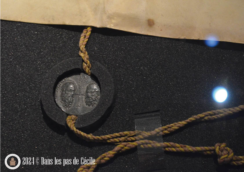 Dans l’espace d’exposition, une bulle papale de la confrérie des Charitables de Béthune du 16e siècle. Nous pouvons y retrouver un sceau en plomb. Cette bulle est une indulgence pour les pêcheurs repentis. Elle est obtenue en contrepartie d’un acte de piété.