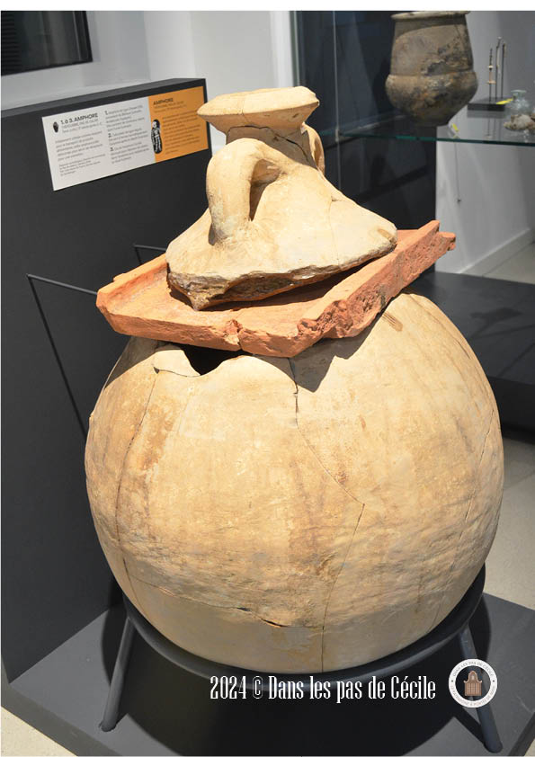 Il s’agit d’une amphore, et nous la connaissons comme récipient pour transporter de la nourriture. Mais celle-ci a été réutilisé et transformée pour devenir une urne funéraire. Dans cette urne qui a été retrouvé sur la commune de Thérouanne, les archéologues y ont retrouvé des restes de cendre du défunt ainsi que divers objets. Pour refermer l’urne, une tuile plate est utilisée et ensuite le col a été replacé au-dessus.
