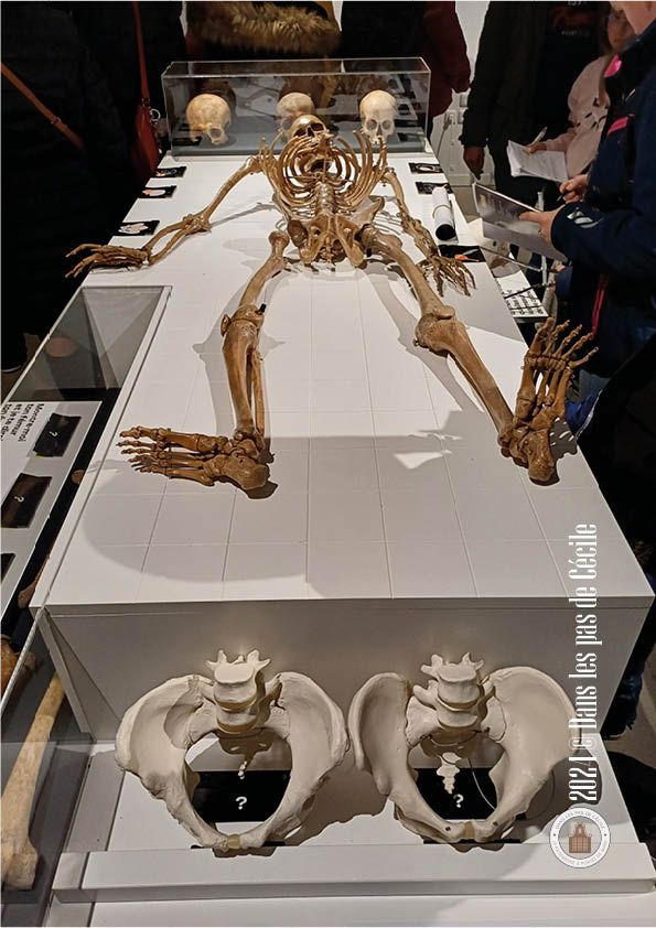 L’espace laboratoire de l’exposition avait en son centre, une plateforme avec un squelette entouré de plusieurs outils pédagogiques afin de comprendre le travail et les techniques utilisées par les archéologues pour déterminer l’identité des ossements. J’ai trouvé que cet outil était très pédagogique et permettait à tous de pouvoir comprendre le travail d’analyse en en effectuant certaines soi-même avec les fac-similés présentés dans l’exposition.