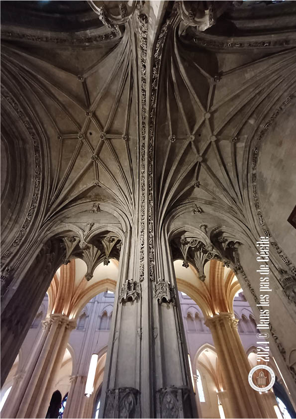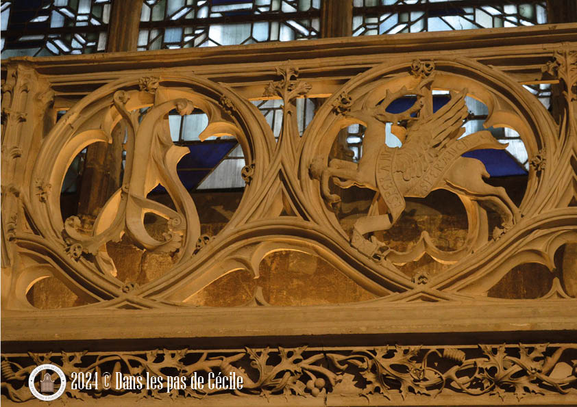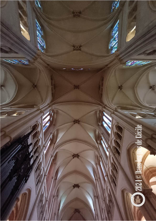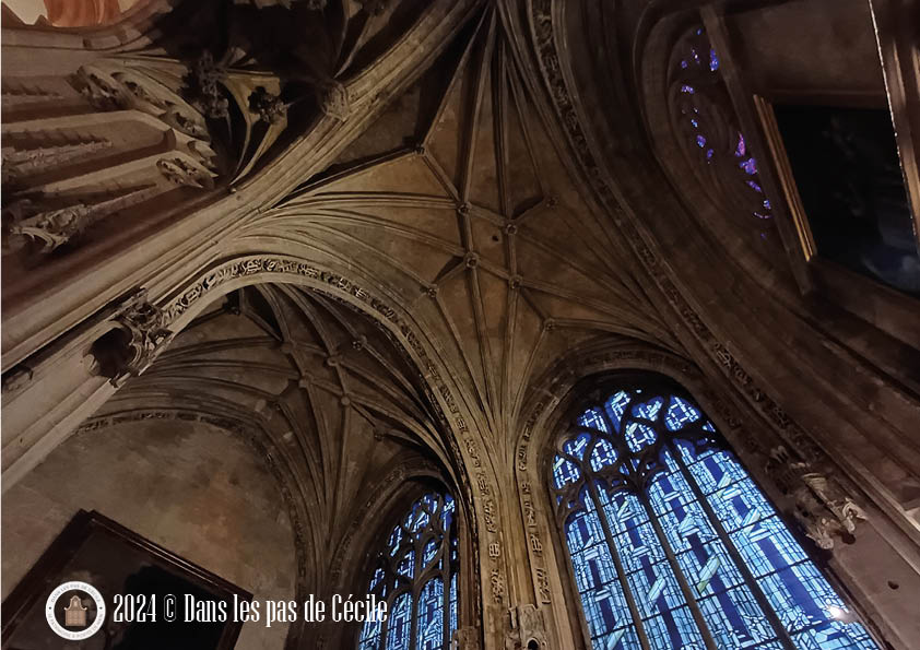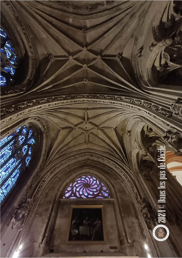 Vous connaissez mon amour pour l’art gothique, eh bien j’ai été servi avec la chapelle des fonds baptismaux, qui est l’ancienne chapelle funéraire de Charles de Bourbon, archevêque de Lyon au 15e siècle. Elle est commencée en 1486 et achevée en 1508 par les soins de son frère Pierre, duc de Bourbon, comte du Forez er souverain des Dombes. Dans le décor ont y retrouve en plus de la dentelle gothique, le chiffre et le dextrochère (un dextrochère est un bracelet que les Romains et les Romaines portaient au poignet droit [en latin dextra, « droite »]. En héraldique, un dextrochère est un bras droit représenté plus ou moins vêtu, tenant le plus souvent une épée) de Charles de Bourbon qui alterne avec les monogrammes de Pierre de Bourbon et d’Anne de France, ainsi que la devise « N’espoir ne peur » et le cerf ailé. Voici quelques photos de ce décor gothique flamboyant.