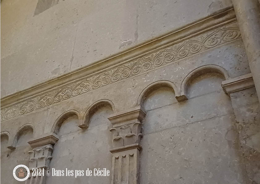 La frise visible dans le chœur est identique à celle que nous pouvons retrouver dans la cathédrale Saint-Étienne de Vienne : elle est composée de bas-reliefs, le plâtre et la brique pilées sont utilisés pour combler les espaces. L’influence pour les décors est d’origine romaine avec les pilastres supportant la frise. L’Antiquité se fait encore sentir avec les dalles de marbres qui proviennent de monuments romains.