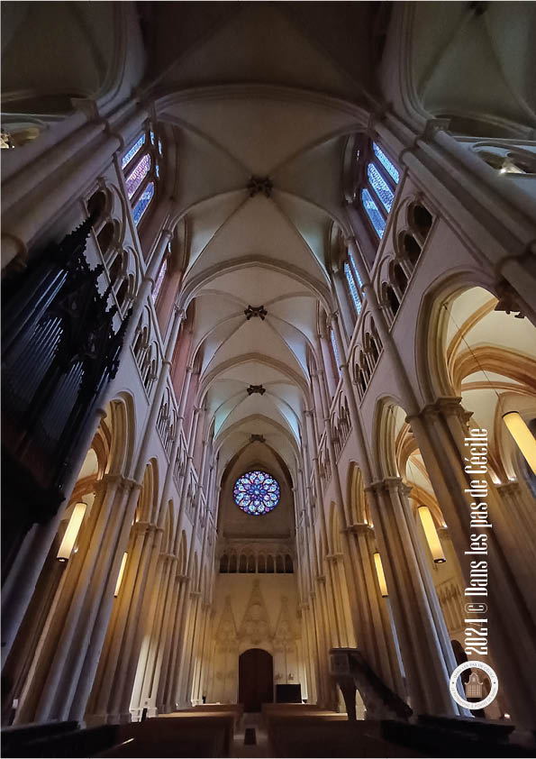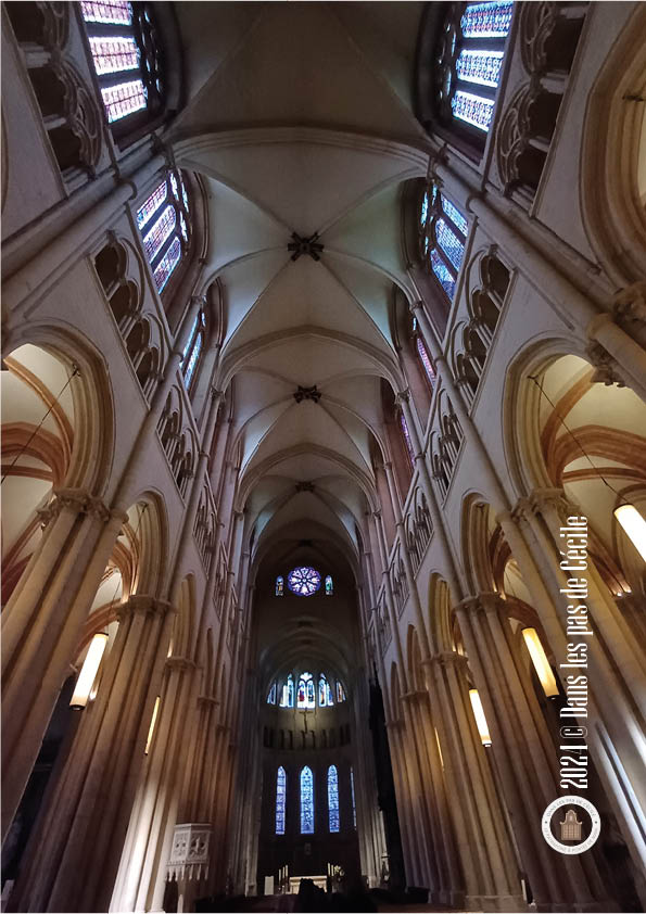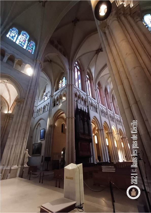 Une fois entré à l’intérieur de l’édifice, nous notons l’absence de déambulatoire (couloir de circulation installée autour du chœur), qui est une caractéristique des églises lyonnaises. L’unité gothique est visible avec la nef composée de voûtes d’ogives sexpartites qui retombent sur de fines colonnes engagées.