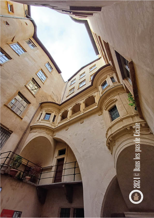 La tour des escaliers dans les traboules dépassent toujours les toits. Il peut aussi y avoir un belvédère qui est une ouverture sans fenêtre et qui est un point de surveillance. Quand plusieurs belvédères sont édifiés, cela montre la richesse.
