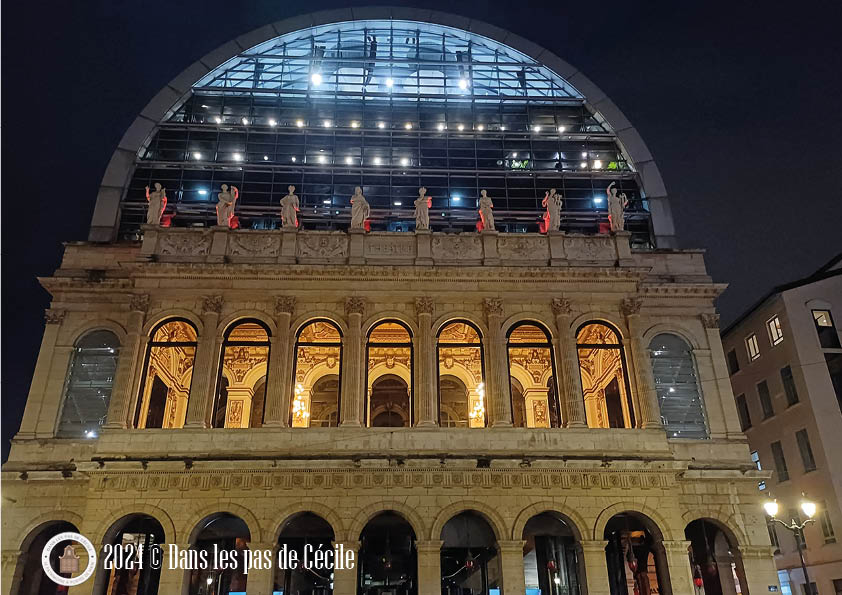 Et pour ternimer (pour de vrai cette fois ci 😉),parlons de l’Opéra. Il s’agit de l’ancien théâtre néo-classique de 1831,signé par l’architecte Paul Chenavard, avec une façade qui a été restaurée. Le fronton conserve les muses que les impératifs de la symétrie avaient limitées au nombre de huit (excluant Uranie, la muse de l’astronomie). De nos jours, ces muses semblent soutenir l’immense verrière semi-cylindrique, prouesse de l’architecte Jean Nouvel.