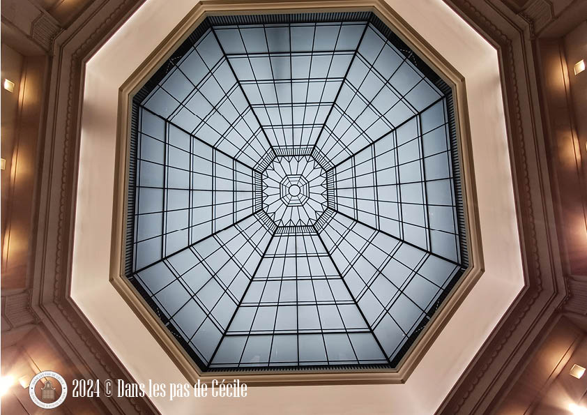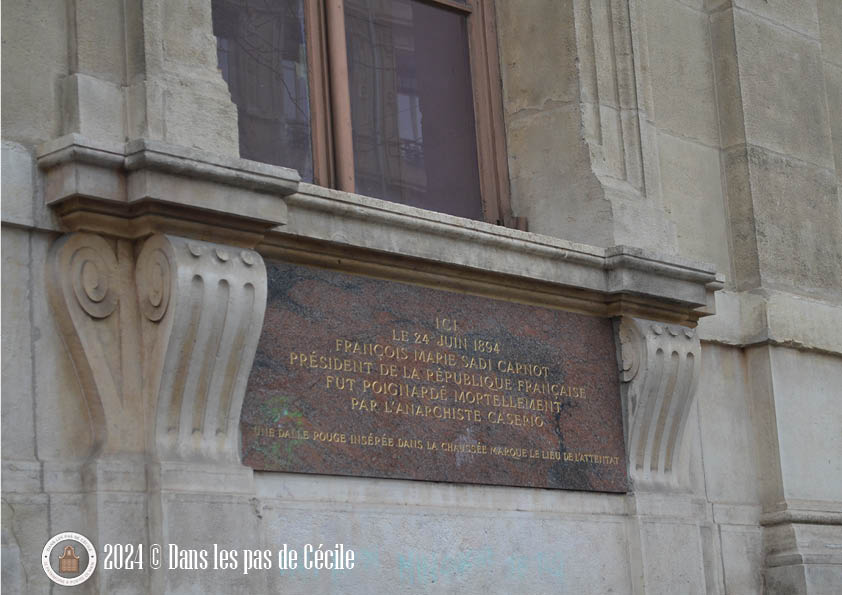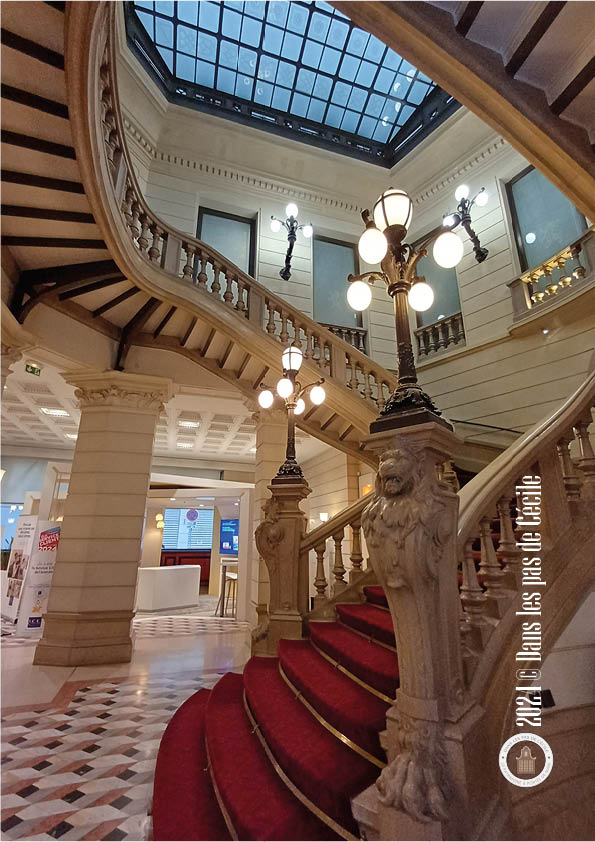 Nous avons traboulé dans le Crédit Lyonnais, bâtiment splendide dont vous pouvez apercevoir l’escalier en photo juste au dessus qui est de style Art Nouveau. C’est la première banque moderne parce qu’il ne s’agit pas de capitaux familiaux. A l’extérieur nous pouvons y voir une plaque indiquant que Sadi Carnot s’est fait assassiner ici après avoir inauguré l’exposition universelle.
