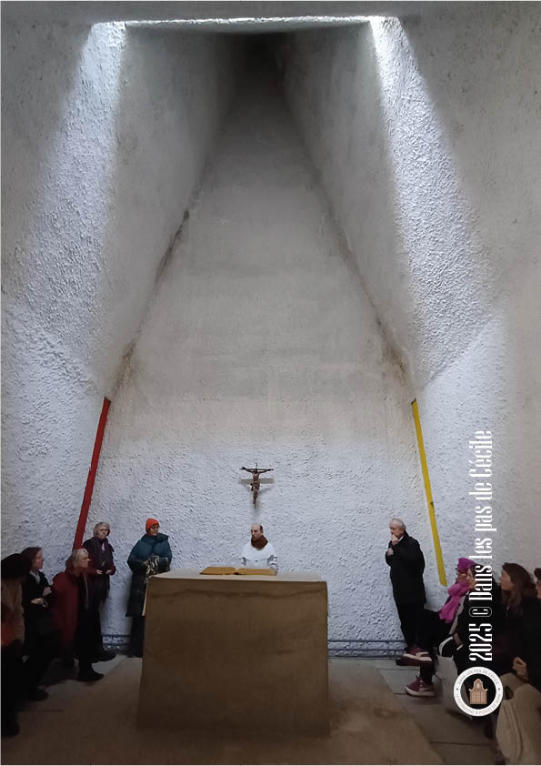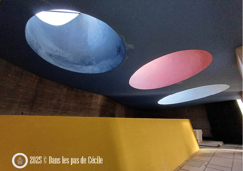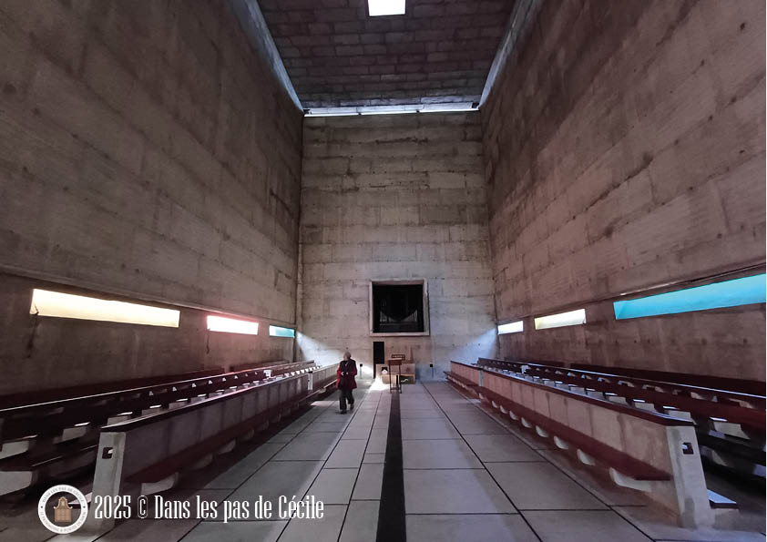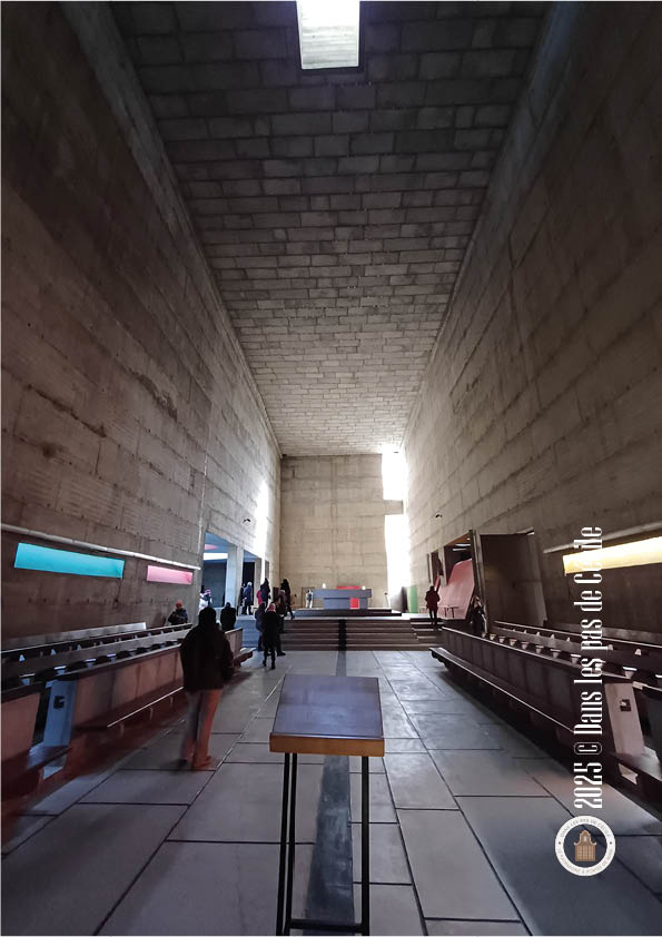 Vous allez découvrir l’église qui, comme le reste du site, est très sobre avec quelques couleurs sur les murs ou les espaces de séparation comme la sacristie (derrière un mur rouge) ou la crypte (derrière le mur jaune).