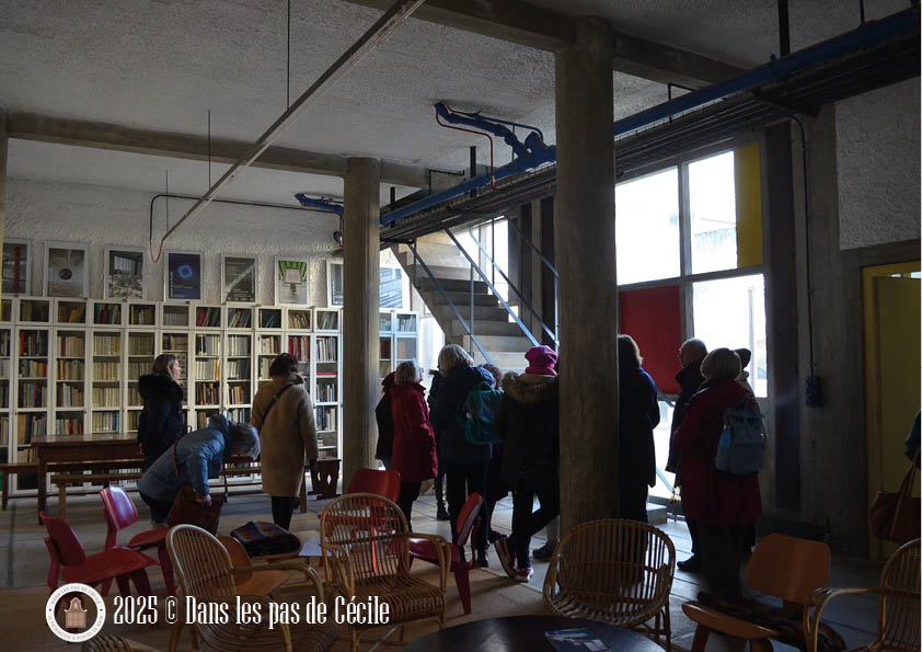 Première étape, la salle des hôtes. A l’origine c’était la salle pour les frères étudiants. Cette pièce est très intéressante parce qu’elle permet de comprendre l’essence même du bâtiment, du travail de l’architecte. Il n’y a pas de coffrage pour les fils électriques et ceux pour la canalisation par exemple. Ils sont intégrés à la vie quotidienne et ne pas oublier l’aspect pratique d’un accès rapide s’il y a besoin de faire des réparations. Les couleurs que nous avons pu apercevoir sur les murs n’ont aucune référence symbolique, elles sont utilisées uniquement pour faire un peu de variété pour l’œil 😉