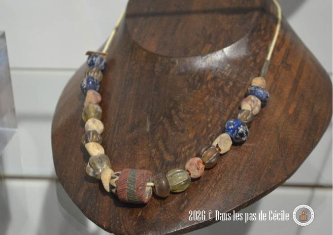 Utilisé depuis ses origines pour la parure, le verre connaît un grand succès sous la forme de perles, voyageant à travers la Méditerranée jusqu’aux confins de l’Europe occidentale. A l’époque mérovingienne (6e-8e siècles), les perles conservent la méthode romaine du verre étiré. Le verre roulé l’emporte au 6e siècle : on fabrique chaque perle individuellement, en ajoutant progressivement des éléments en verre de couleurs différentes, soudés par chauffage au chalumeau. Le décor ainsi obtenu gagne en complexité comme en finesse.