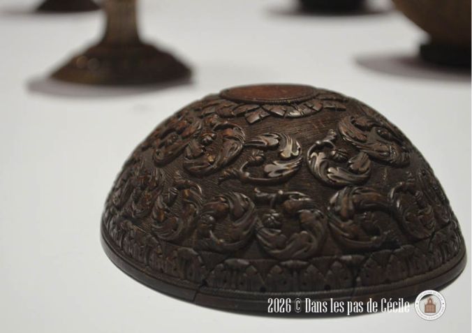 L’exemple de la noix de coco manifeste à la fois l’opportunisme dans le choix du matériau et l’adaptabilité humaine dans sa relation avec l’environnement. Ces noix de coco, sculptées ou gravées, montées dans un cerne de métal ou laissées au naturel du fruit, proviennent des quatre coins du monde. Ce matériau a d’abord suscité, aux 15e et 16e siècles, la curiosité des Européens, qui ont conçu des montures somptueuses pour les noix rapportées d’expéditions lointaines. Dans les régions où pousse le cocotier, les noix de coco ont servi de support à la fabrication de contenants variés, souvent ornés. Les trois cavités naturelles de la noix la rendent particulièrement apte à évoquer un visage, caractéristique bien exploitée par les artistes.