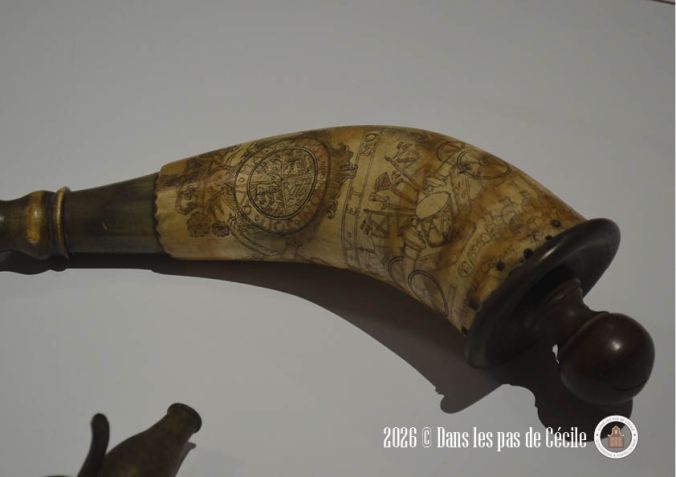 Moins précieux mais impressionnants, les cornes et les bois de cerf sont fréquemment mis à profit pour la fabrication d’ustensiles liés à la chasse ou à la guerre. Au 16e siècle, la généralisation des armes à feu portatives fait de la poire à poudre un accessoire indispensable car, la cartouche n’ayant pas encore été inventée, il faut pouvoir doser avec justesse la poudre. De nombreuses poires à poudre sont réalisées dans des bois de cerf, matériau choisi en raison de son appartenance à l’univers de la chasse. Certaines pourraient avoir été conçues à partir du bois d’un animal chassé par le propriétaire même de l’objet. Les poires à poudre en corne témoignent, quant à elle, d’une fabrication par l’utilisateur. Peu coûteuses, les cornes sont quasiment utilisées à l’état brut, le décor gravé représentant le seul investissement conséquent. La corne contient d’ailleurs imparfaitement la poudre car elle est sensible à l’humidité et tend à se fendiller. Sa translucidité permet en revanche d’observer de l’extérieur le niveau de poudre